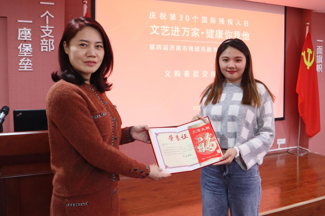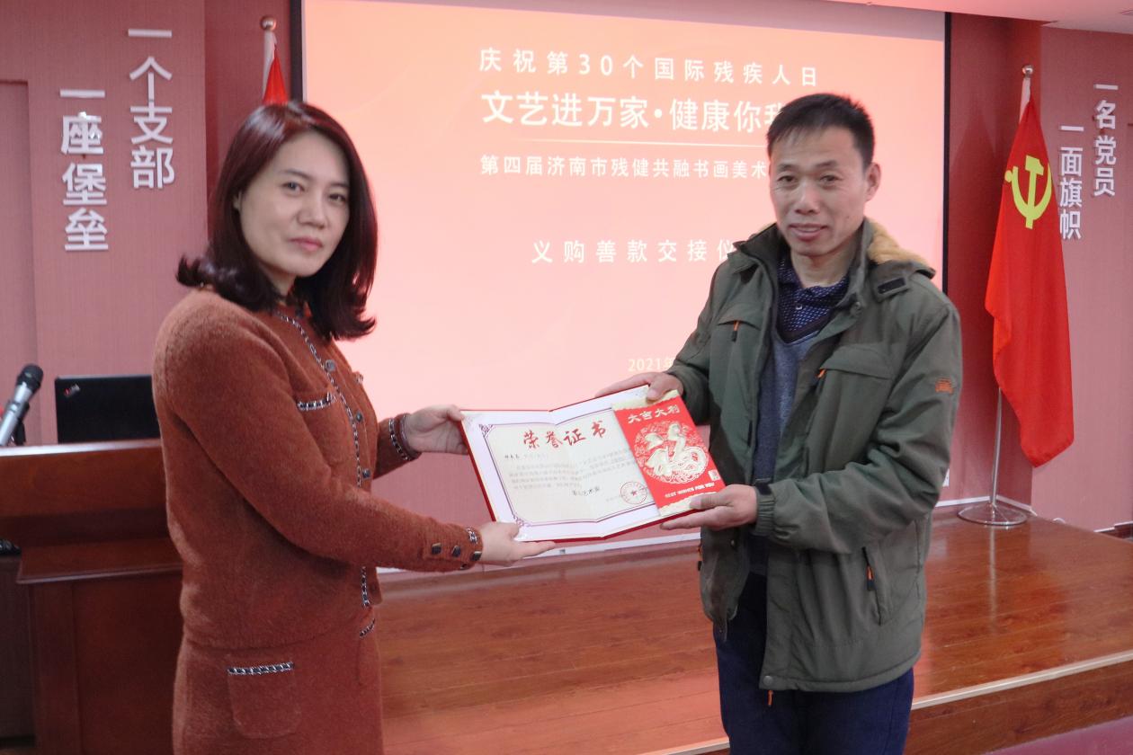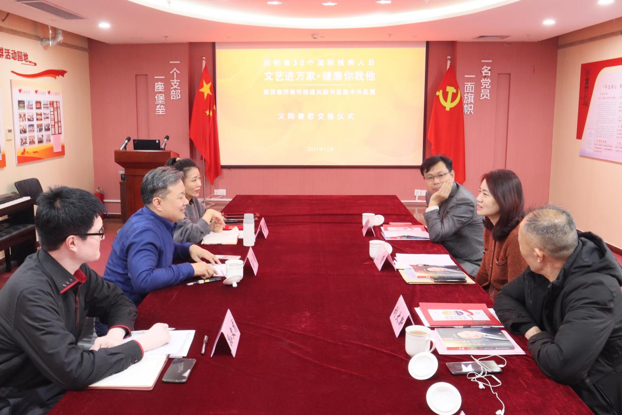 12月15日,“文艺进万家•健康你我他”第四届济南市残健共融书画美术作品展义购善款交接仪式在必威平台党群活动室举行。济南市文学艺术界联合会组联部主任范莹,济南市残疾人联合会宣文处副处长刘大新,济南市残疾人文学艺术界联合会主席、必威平台党支部书记王勇出席,书画作品作者代表参加活动。