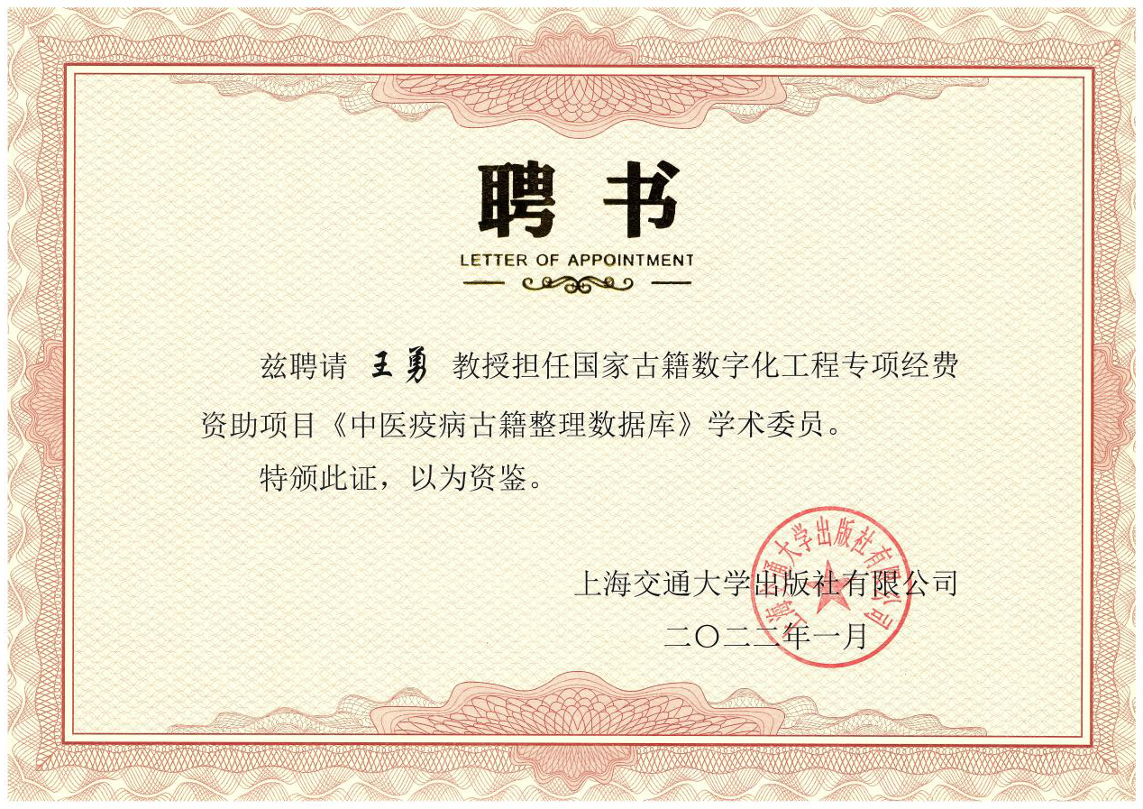 会上成立了《中医疫病古籍整理数据库》学术委员会,王勇博士受聘《中医疫病古籍整理数据库》学术委员,现场领取聘书。