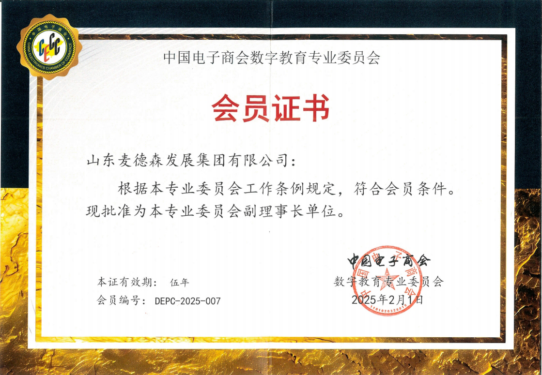 会上,山东麦德森发展集团有限公司荣膺中国电子商会数字教育专业委员会第一届副理事长单位,集团党委书记、董事长王勇当选中国电子商会数字教育专业委员会第一届理事会副理事长。
