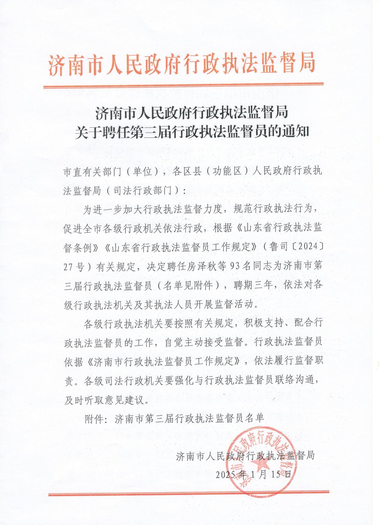 日前,济南市人民政府行政执法监督局发布《济南市人民政府执法监督局关于设立济南市第一批行政执法监督企业联系点》及《济南市人民政府行政执法监督局关于聘任第三届行政执法监督员的通知》。