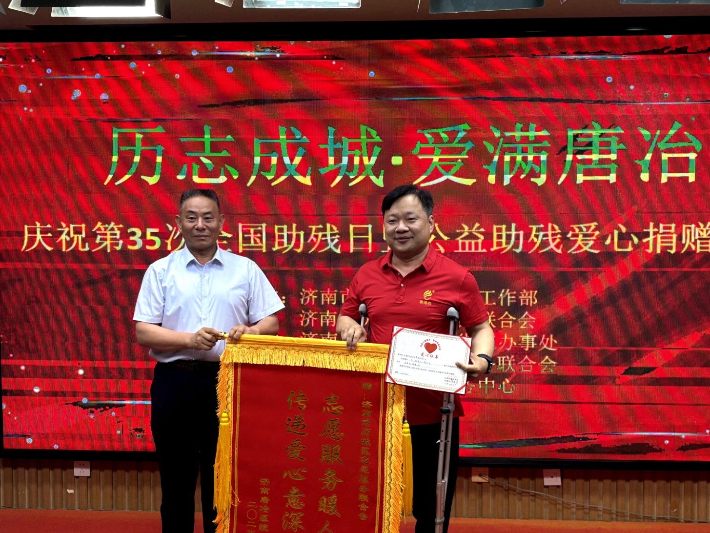 捐赠环节中,王勇书记与吴维合理事长共同向残障儿童和残疾人代表发放爱心物资及心愿礼包。历城区残联党组书记罗矗、唐冶街道民生事务办公室副主任韩娜分别向志愿服务联合会和人人公益服务中心回赠锦旗,表彰公益贡献。