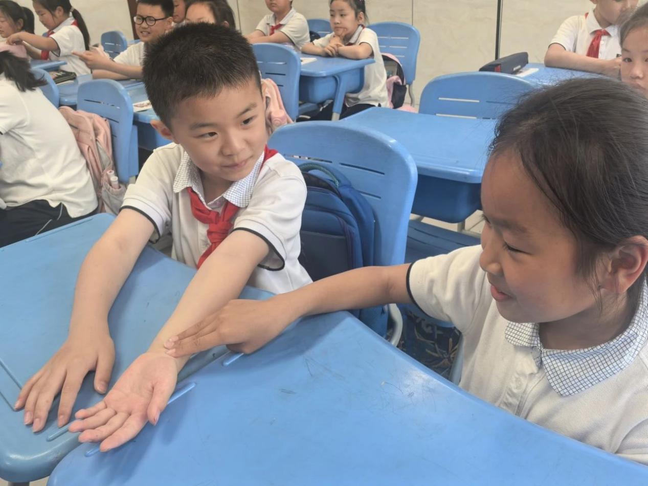 最后,王勇书记亲自为同学们示范把脉的方法。在王勇书记的指导下,孩子们纷纷伸出小手,有模有样地在穴位上轻轻按压,现场洋溢着浓厚的学习氛围。通过亲身体验,孩子们领略了中医的神奇魅力,同时掌握了一些实用的自我保健小技巧。