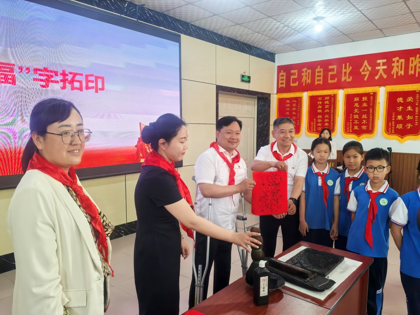 活动中,致公党委员郭映雪宣读《致港沟中心小学生的倡议书》,呼吁少先队员传承红色基因、践行时代责任;山东博物馆专家殷良玉老师带来“汉字的起源与演变”专题课;现场“福”字拓印体验环节,让孩子们在实践中触摸历史,增强文化自信。