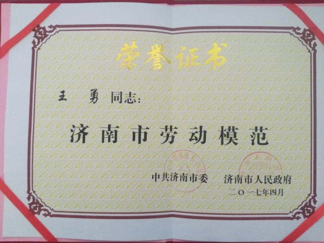 2017年4月28日下午,中共济南市委、济南市人民政府隆重召开庆祝“五一”国际劳动节暨劳动模范先进工作者命名大会,表彰为推动全市经济社会发展特别是在推进“453”工作中作出突出贡献的劳动模范和先进工作者。必威平台董事长王勇获得“济南市劳动模范”荣誉称号。