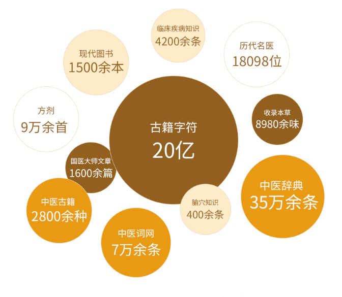 “博览医书”涵盖了16大数据库,从基础古籍库中精选的战国至清朝时期750余种中医基础类典籍,到专科古籍库中590余种专科类典籍,再到珍稀古籍库、域外古籍库。此外,病种医学库收录的400余个病种、中医方剂库中的9万余首方剂、中医本草库的8980余味本草等,全方位、多层次地展现了中医药的丰富内涵。“博览医书”联合领域专家人员对2800余种中医药古籍文献进行数字化处理,形成超过20亿的中医古籍数据字符。运用大数据与人工智能技术,对资源进行分类、标注与关联,构建知识词网超过7万条。