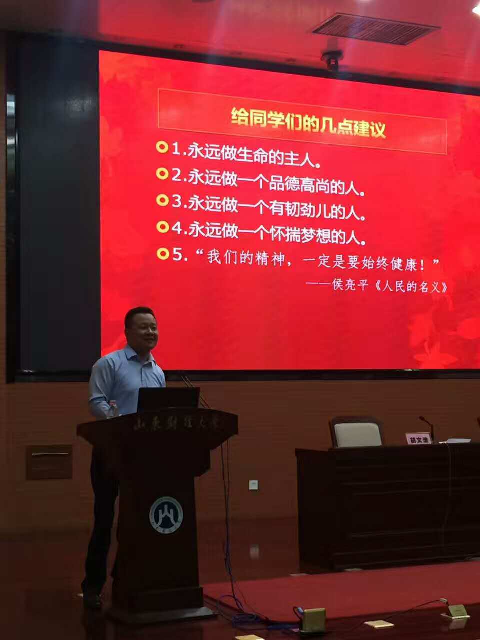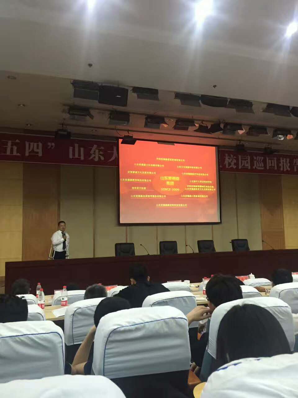 我集团董事长王勇作为第三届“山东大学生十大创业之星”受邀参加了此次报告会。在这次开展的迎“五四”山东大学生创业之星校园巡回报告会中现身说法,传播创业文化,分享创业经验和体会,以自身为例,向广大青年学生展示了“奋斗的青春最美丽“这句话的含义。王勇董事长给大学生提出了几点建议:1.永远做生命的主人;2.永远做一个品德高尚的人;3.永远做一个有韧劲儿的人;4.永远做一个怀揣梦想的人;5.“我们的精神,一定要始终健康!激励在校大学生开启创业理想、积累知识财富。
