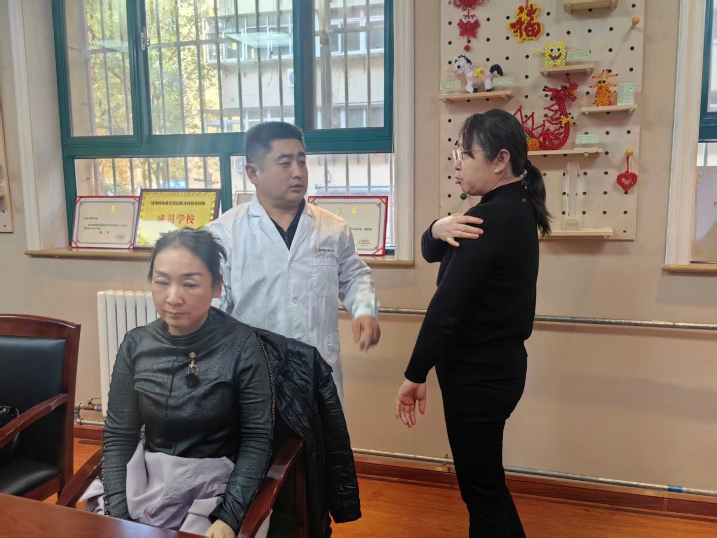 仪式结束后,活动进入温情满满的义诊环节。集团旗下盲手道项目高级推拿师黄旺与山东新中鲁中医医院医疗团队共同为济南市黎明学校教职员工提供健康咨询、中医把脉、推拿按摩、常见病预防建议等“义诊”服务。活动的开展不仅是对特教工作者的暖心致敬,更是优质医疗资源向助残工作者延伸的切实举措,让“你们守护孩子,我们守护你们”的温暖承诺落地生根。