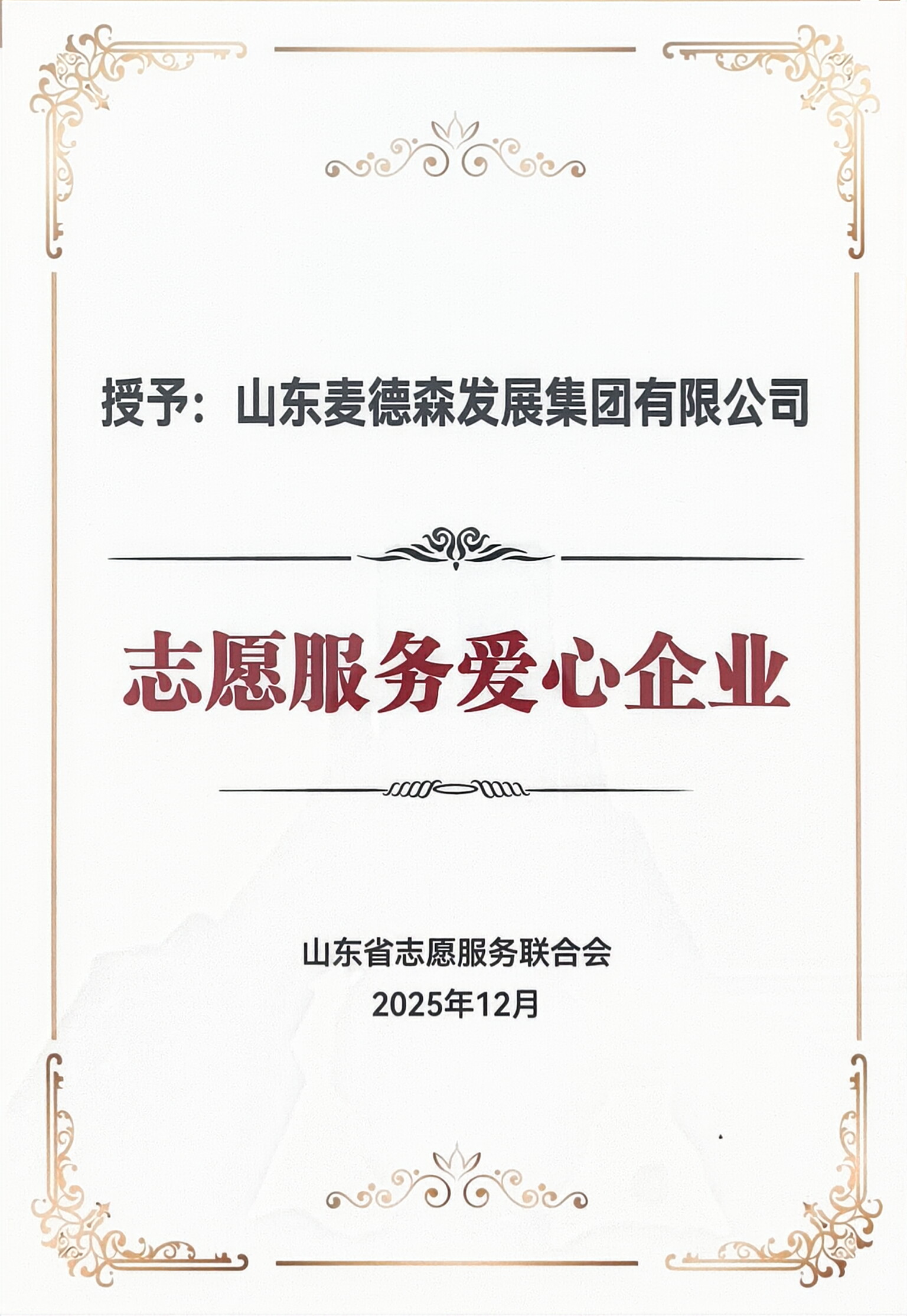 麦德森获颁山东省志愿服务联合会“志愿服务爱心企业”殊荣