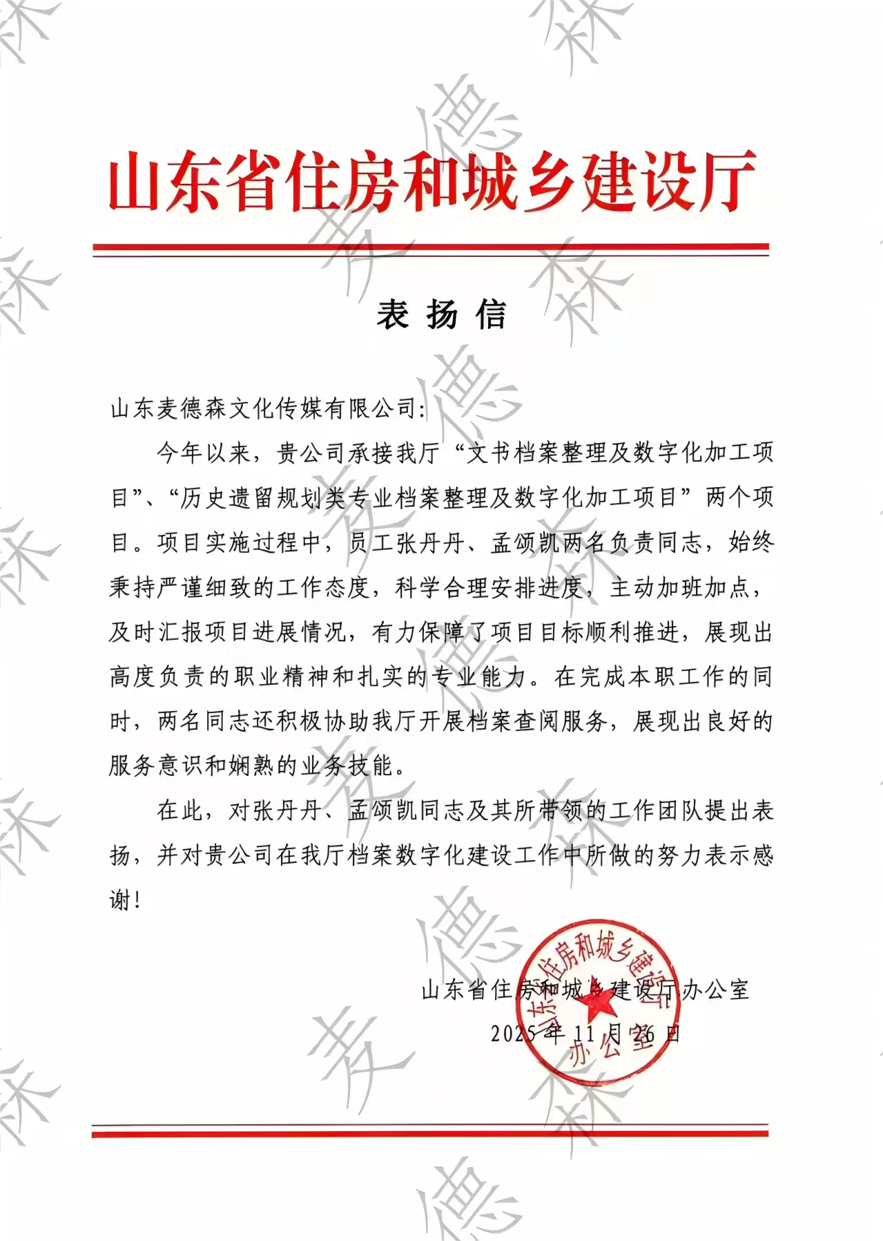 值得一提的是,山东省住房和城乡建设厅在验收后特向麦德森致送表扬信。信中指出,在项目实施过程中,项目经理张丹丹、孟颂凯两位同志带领团队,展现出高度的责任心、严谨的专业态度和卓越的协作精神。他们不仅科学统筹、加班加点保障项目高质量推进,还主动协助厅内档案查阅服务工作,其专业能力与服务意识得到了充分认可与肯定。