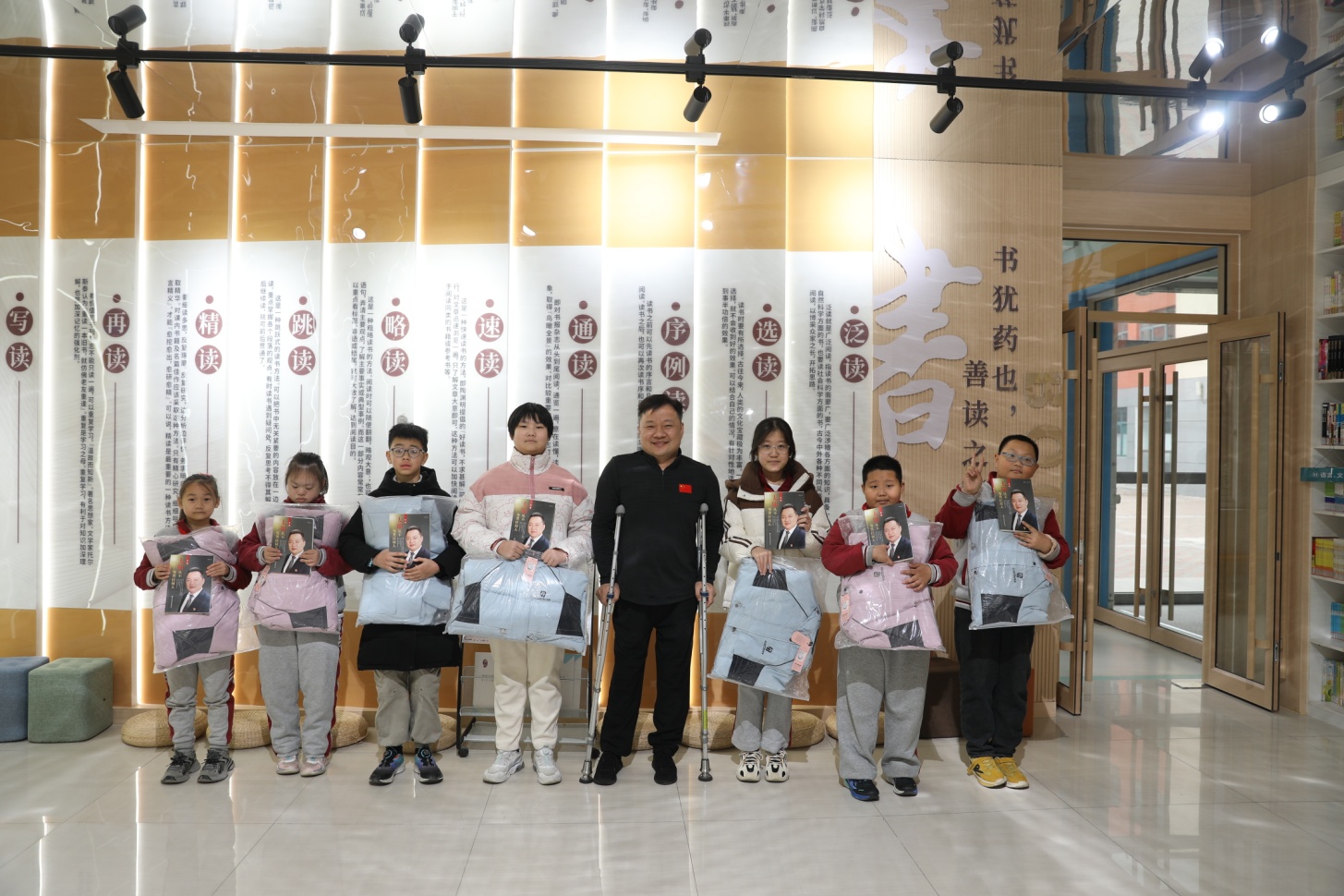 在唐冶小学活动现场,校方详细介绍了受助学生的家庭情况与学习近况。随后,举行了简短而隆重的捐赠仪式,慰问团为现场8名困难学生代表发放了精心准备的“新春爱心礼包”。礼包内含书包、文具等学习生活物资,以及王勇书记的个人传记《太阳从不亏欠任何人》,不仅承载着物质上的帮扶,更传递了精神上的慰藉。