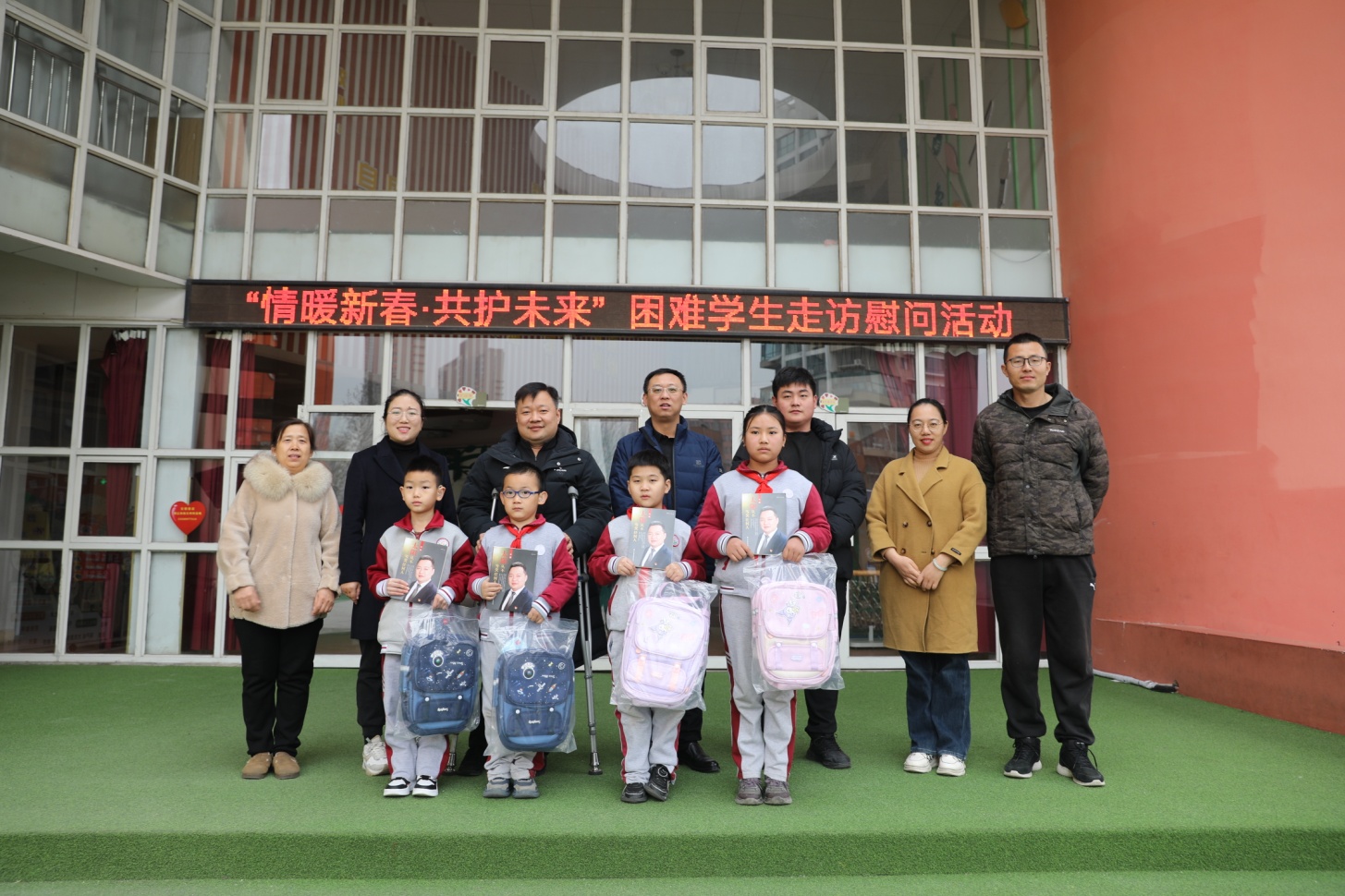 离开唐冶小学后,慰问团队马不停蹄地前往唐官小学。在这里,慰问团同样为该校的4名困难学生送上了“新春爱心礼包”。