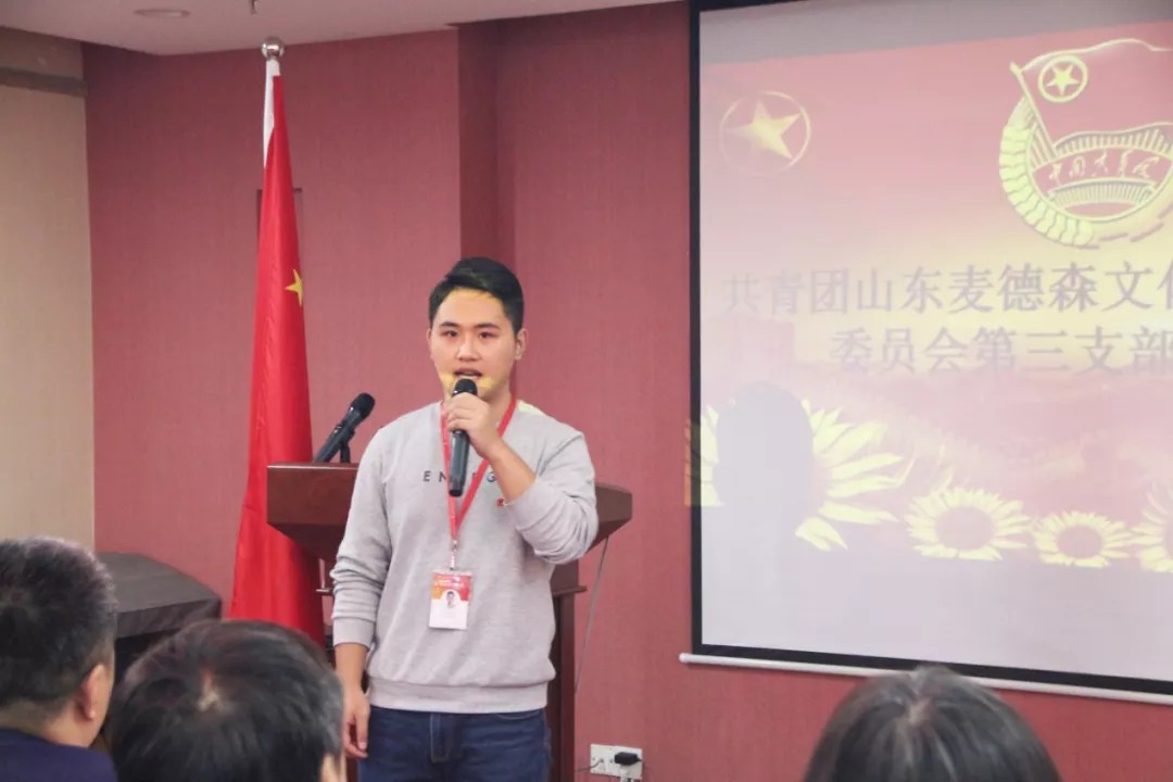 12月20日,共青团山东麦德森文化传媒有限公司委员会第一支部团员大会在集团党群活动室隆重召开,按照团支部成立的组织程序,第一届团委委员候选人依次上台向大会汇报了自己的思想、学习、工作等方面的表现,表达了自己愿意用实际行动团结青年、引导青年和服务青年的积极态度。