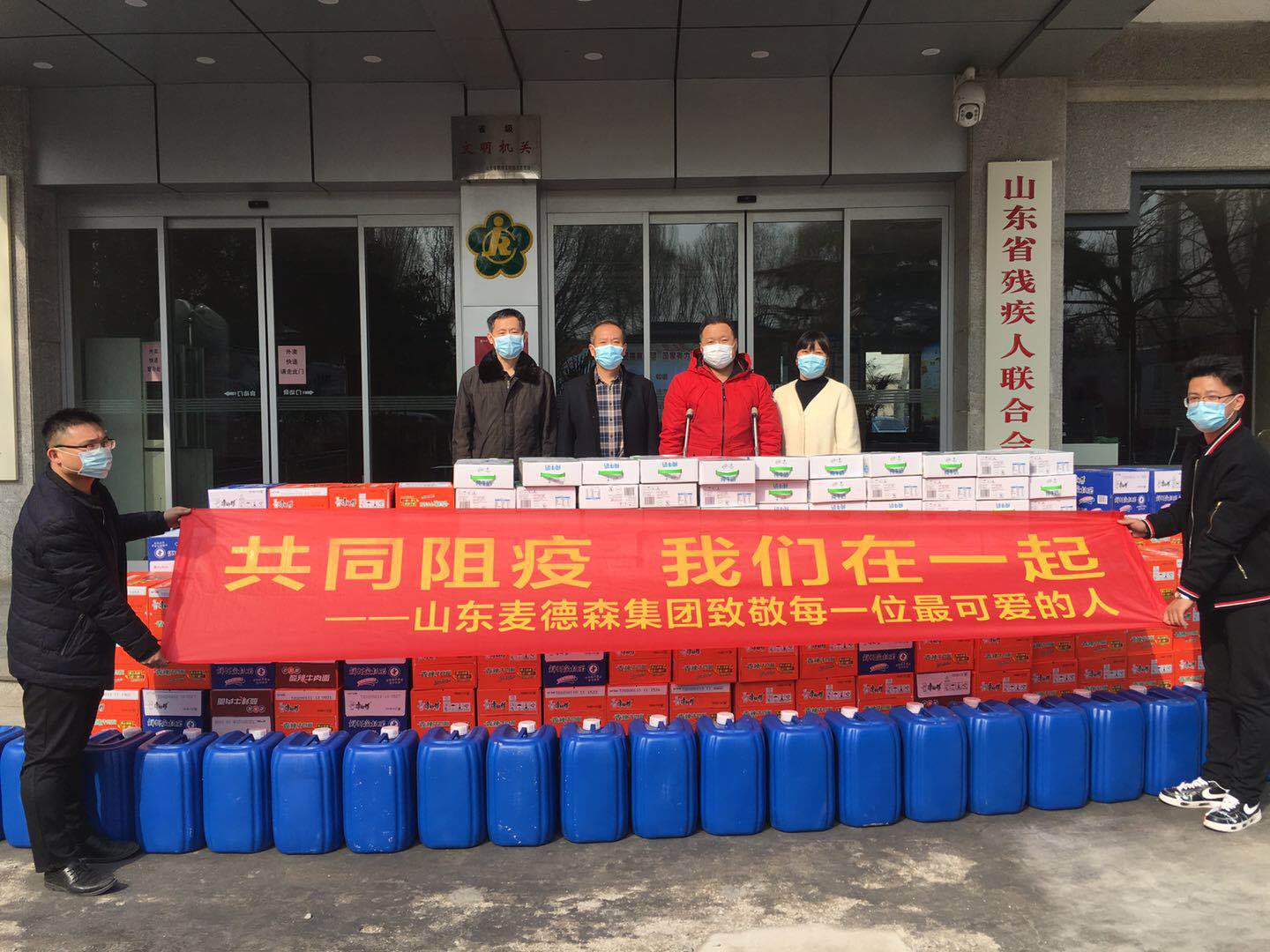 3月2日,我集团党支部书记王勇博士带领企业员工来到山东省残疾人联合会,向省残联捐赠消毒液等爱心物资,助力广大残疾人兄弟姐妹们共同打赢疫情防控阻击战。