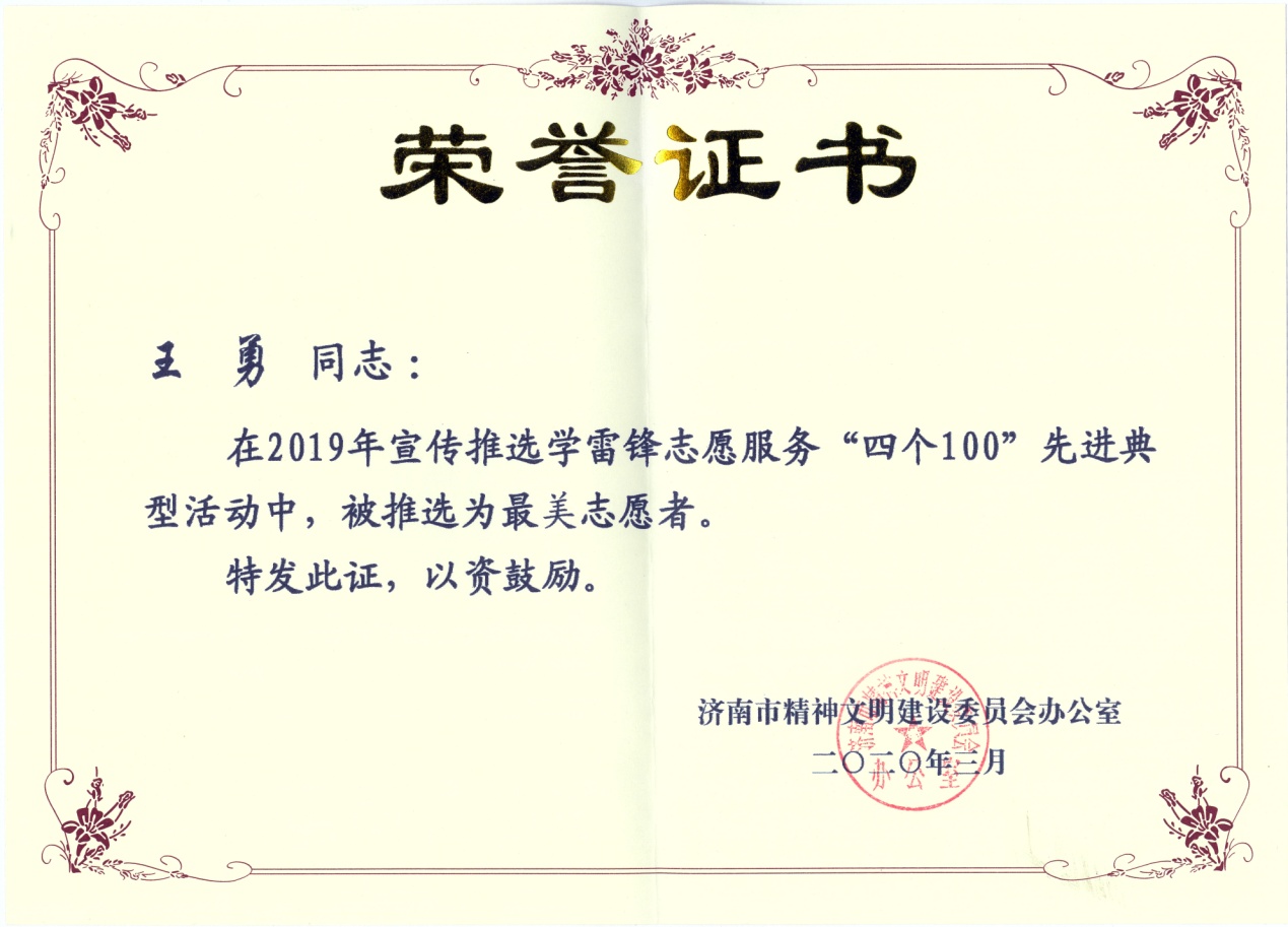 近日,我集团党支部书记王勇博士在2019年宣传推选学雷锋志愿服务“四个100”先进典型活动中,被济南市精神文明办公室授予“最美志愿者”。
