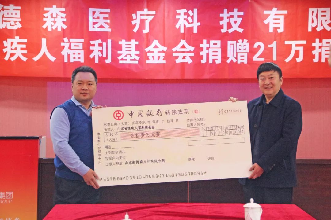 为积极承担企业社会责任,进一步推进扶残助学慈善工作的开展,2019年2月,王勇博士代表集团向山东省残疾人福利基金会捐赠助残善款21万元。
