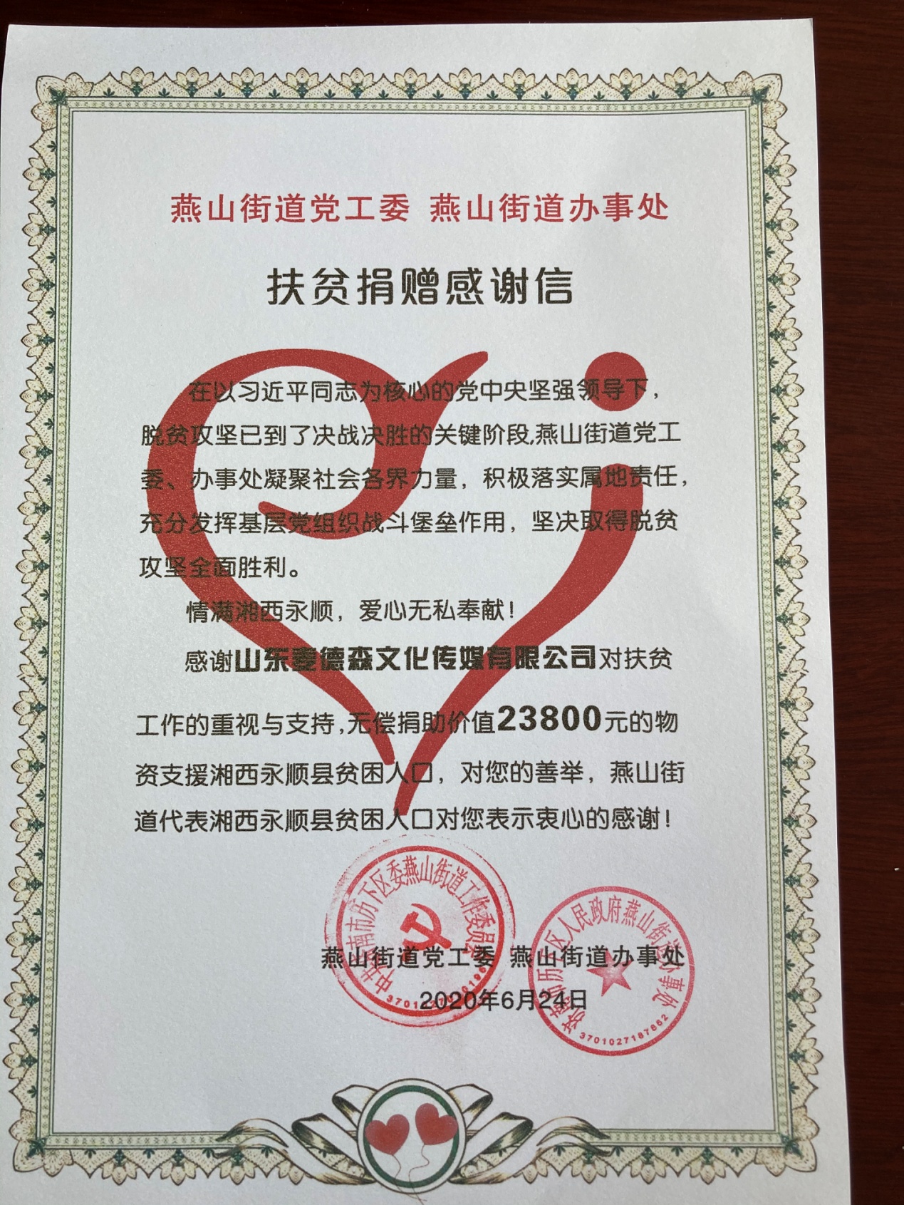2020年是全国脱贫攻坚决战决胜年,也是全面建成小康社会的收官之年。为持续助力协作打赢脱贫攻坚战,携手步入小康社会,6月24日,“情满湘西永顺、爱心无私奉献”山东麦德森文化传媒有限公司扶贫捐赠仪式在燕山街道办事处举行。