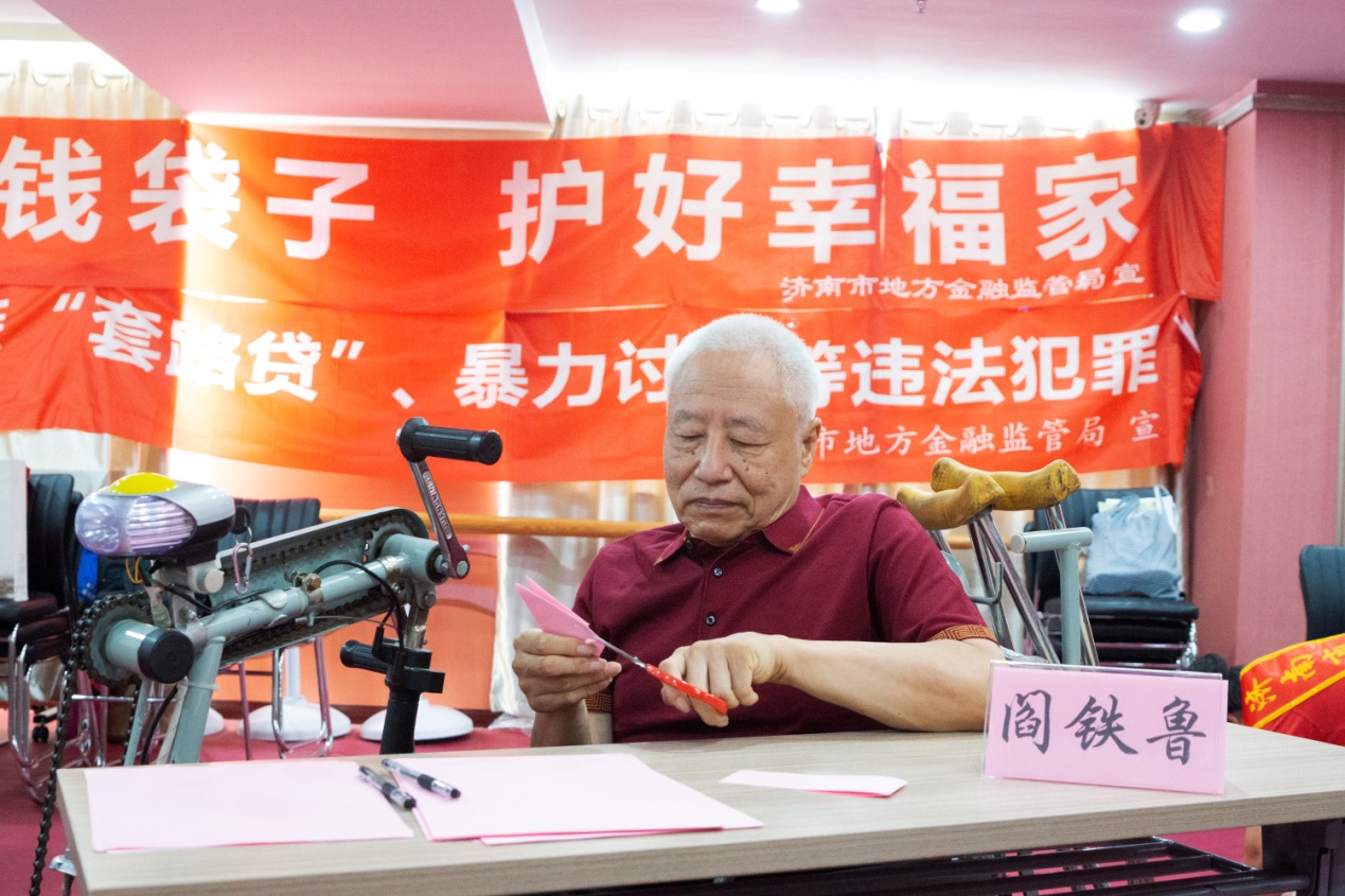 在泉城金融卫士志愿者宣传团组织开展主题党日活动的同时,残疾人艺术家“防范非法集资金融诈骗”主题专场笔会正式开始。众位残疾人画家、书法家纷纷拿起画笔泼墨挥毫,剪纸艺术家拿起剪刀精雕细琢,现场气氛热烈。