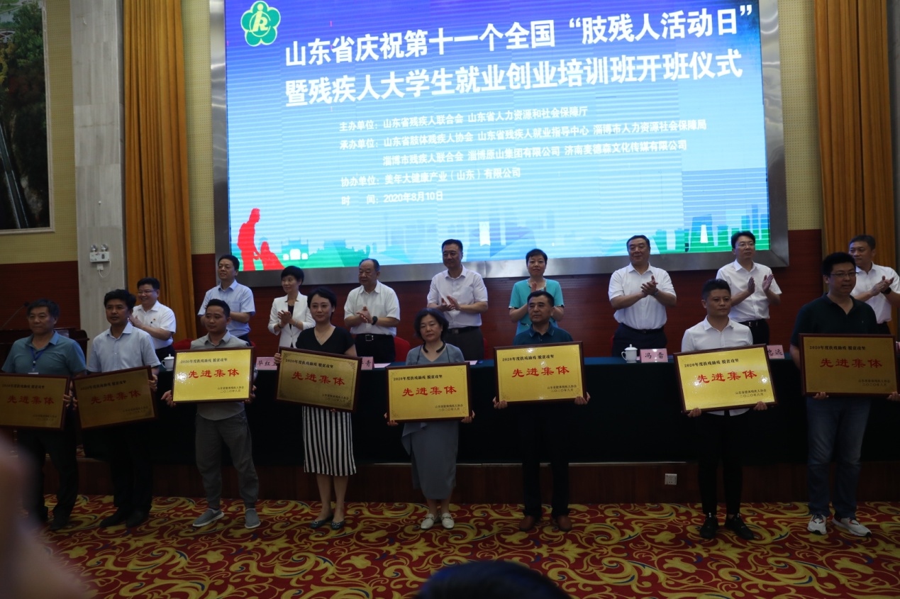 近日,山东省庆祝第十一个全国“肢残人活动日”暨残疾人大学生就业创业培训班开班仪式在山东原山艰苦创业教育基地举行。中国肢残人协会主席王建军,山东省残疾人联合会党组书记、理事长邹斌芳,省人力资源和社会保障厅党组副书记、副厅长、一级巡视员夏鲁青等领导出席活动。活动中,必威平台等爱心企业被授予“2020年度扶残助残、脱贫攻坚先进集体”,集团旗下新中大职业培训学校招生主任贺姜磊现场领取荣誉奖牌。