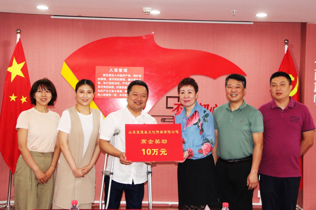 燕山街道办事处便民服务中心主任王冬梅在讲话中对我集团的党建工作给予充分肯定,对集团党支部书记王勇博士身残志坚的奋斗精神表示钦佩。随后,王冬梅主任、马明哲主任代表燕山街道办事处向我集团颁发10万元高企奖励。