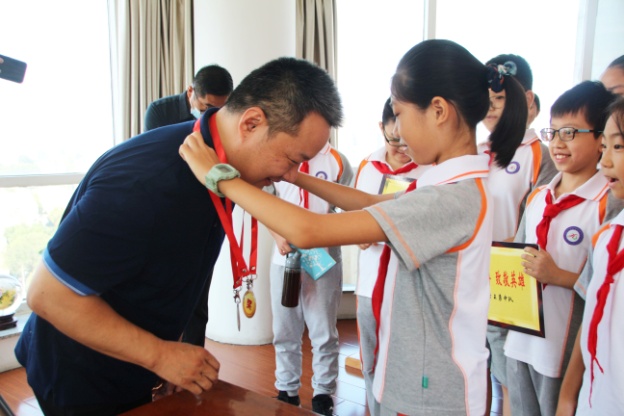 “作为新时代的少年队员,我们要学习您乐观、自强不息、不服输、不认输的精神,不畏困难、积极乐观的人生态度。我们将树立远大梦想,并坚定地用实际行动和努力去实现这个梦想!”在党建活动室,“王勇中队”队员们围绕自己的“梦想”积极与王勇博士进行交流。同时,队员代表亲手为王勇叔叔佩戴了纪念奖牌、纪念奖章,并将大家精心制作的“纪念牌匾”赠送到王勇叔叔手中。