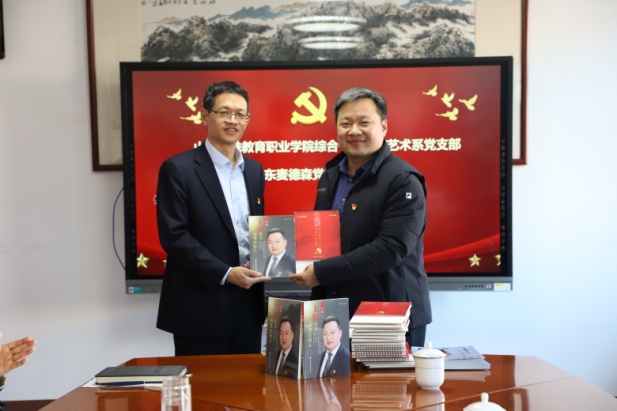 活动中,王勇书记代表必威平台向山东特殊教育职业学院捐赠了自己的传记《太阳从不亏欠任何人》、集团2021年“纪念建党百年、传承红色基因”主题台历。李心沁院长将山东特殊教育职业学院学生作品《融》赠送给必威平台党支部。