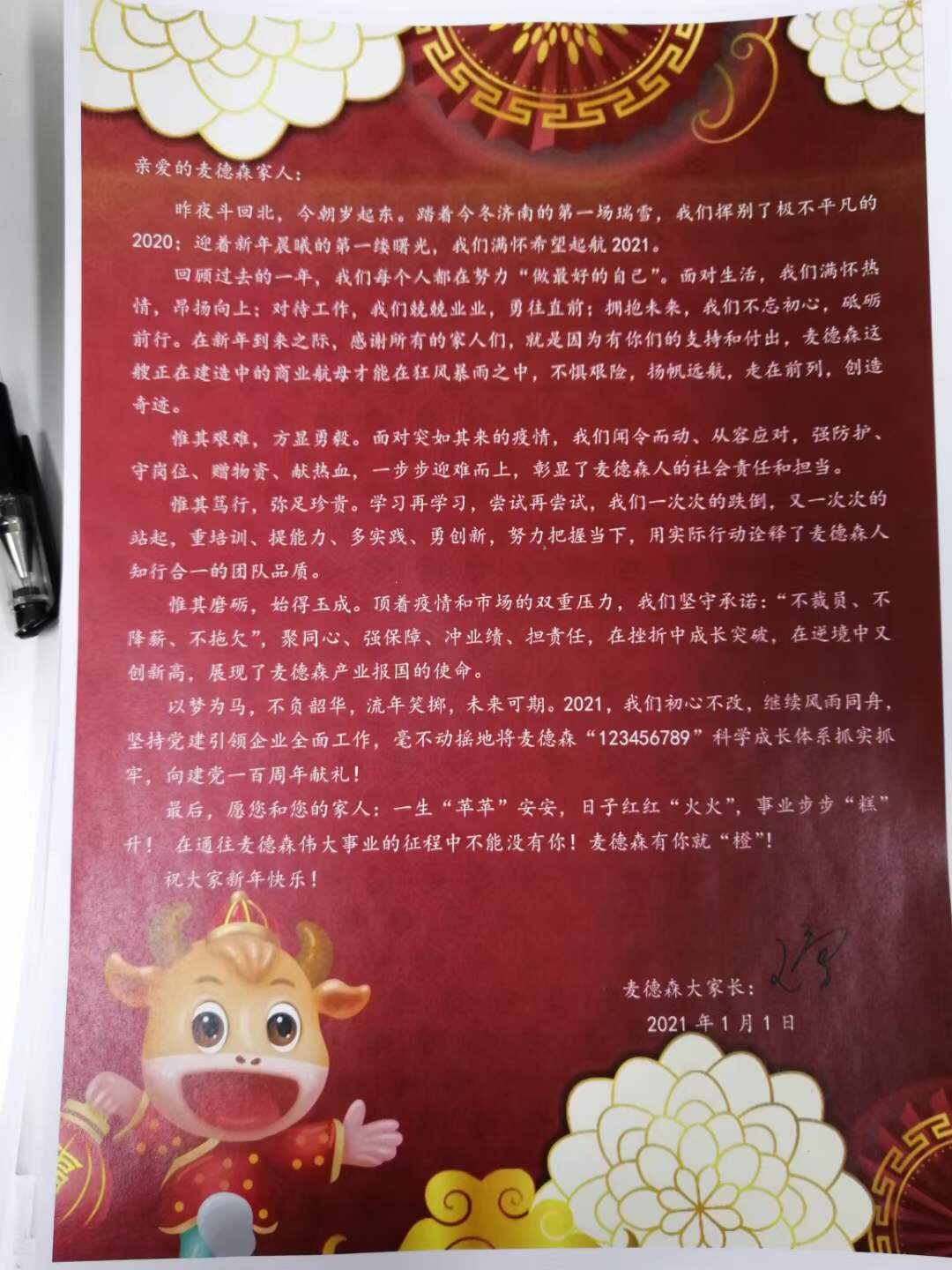 回顾过去的一年,我们每个人都在努力“做最好的自己”。面对生活,我们满怀热情,昂扬向上;对待工作,我们兢兢业业,勇往直前;拥抱未来,我们不忘初心,砥砺前行。在新年到来之际,感谢所有的家人们,就是因为有你们的支持和付出,麦德森这艘正在建造中的商业航母才能在狂风暴雨之中,不惧艰险,扬帆远航,走在前列,创造奇迹。