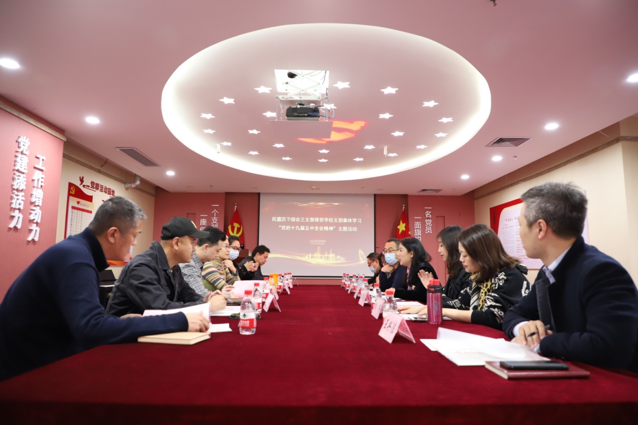 为深入学习领会和全面贯彻落实党的十九届五中全会精神。1月29日,民盟历下综合三支部、商贸学校支部学习“党的十九届五中全会精神”主题活动在必威平台党群活动室举行。民盟盟员、集团执行董事王兴法等出席活动。