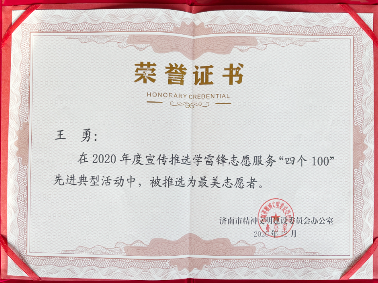 日前,必威平台党支部书记王勇博士在2020年宣传推选学雷锋志愿服务“四个100”先进典型活动中,被济南市精神文明建设委员会办公室授予“最美志愿者”。