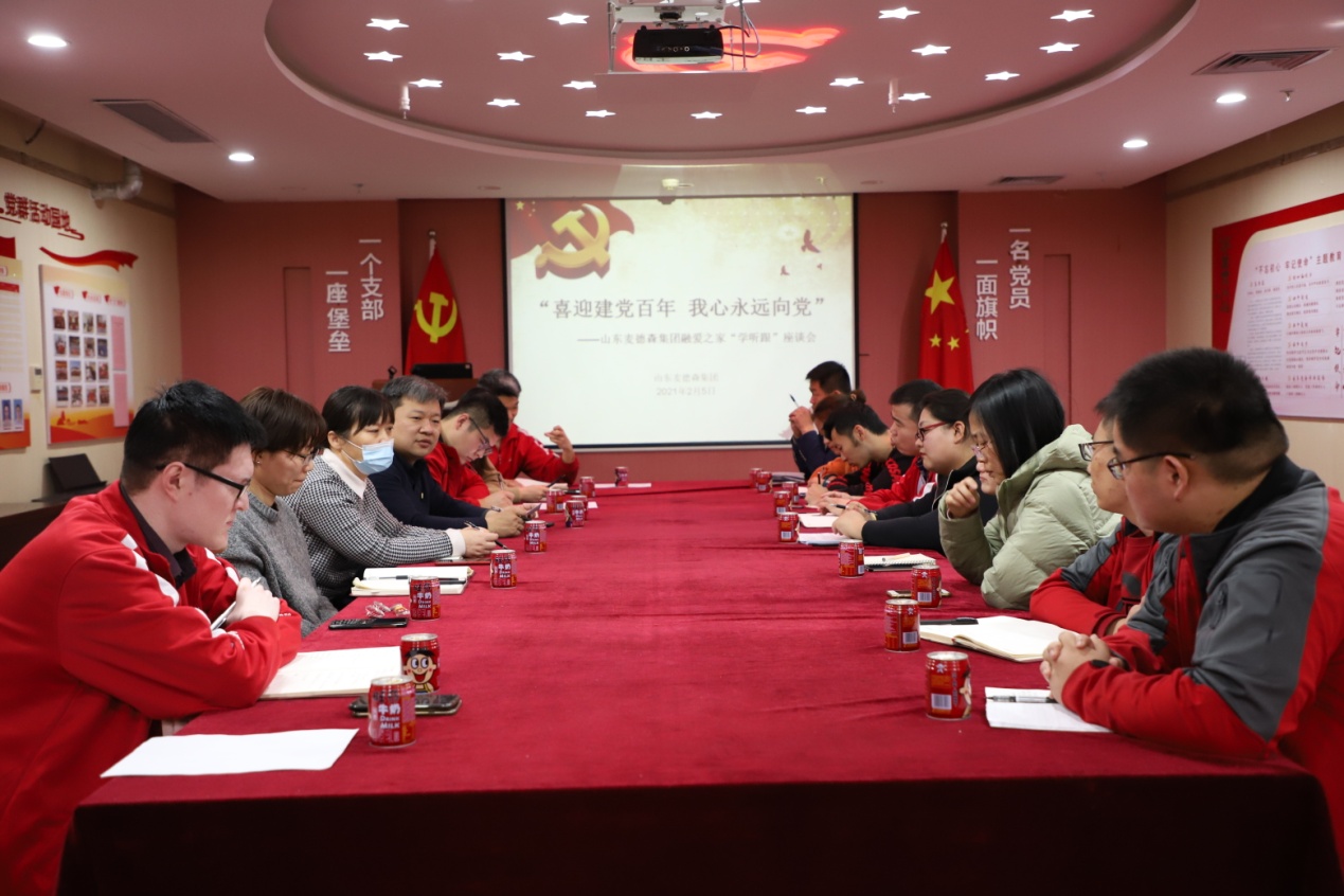 2月5日,集团“融爱之家”在总部党群活动室召开“学听跟”活动暨“喜迎建党百年、我心永远向党”座谈会。集团党支部书记王勇博士、工会主席张晶华等出席座谈会,集团部分党员和残疾职工参加座谈。