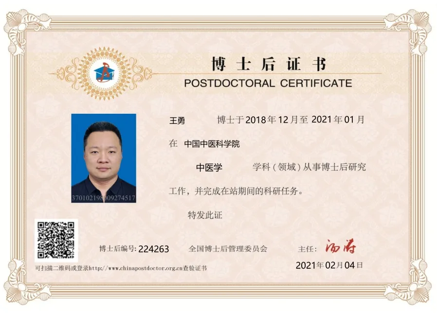 王勇博士于2018年12月至2021年1月在中国中医科学院中医学学科领域从事博士后研究工作,并完成在站期间的科研任务。作为新时代的中医药人,王勇博士将中医药发展与新媒体和大数据等前沿技术有机融合,并借助其博士后研究课题《<黄帝内经>标引方案研究》的科研成果,倾力打造“博览医书”和“搜搜中医”项目,促进区域产业联动,以点带面,助力新旧动能转换,以创新力带动就业力,推动中医药文化走出国门,打造全球性健康产业,形成中医药文化软实力和健康产业全球竞争优势,为中医药学术传承助力,为健康中国建设助力。