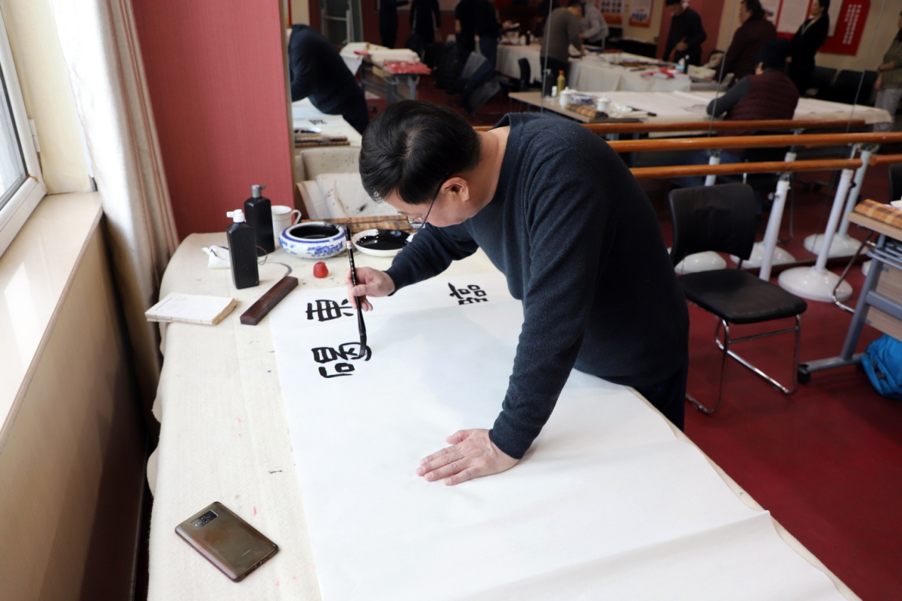 本次活动持续近4个小时,共创作对联、福字、书画作品百余幅。活动结束后,王勇博士与10位书画名家合影留念。