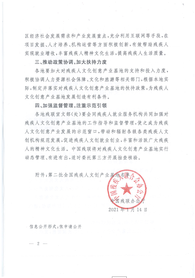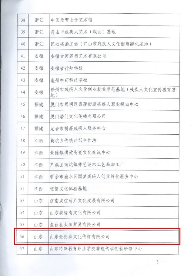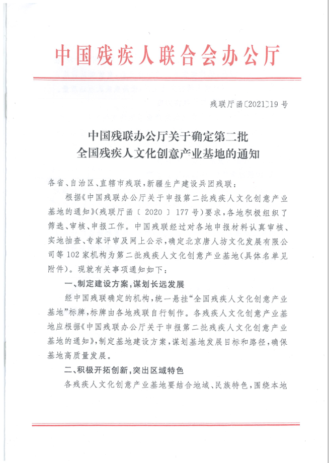 日前,中国残疾人联合会办公厅下发《中国残联办公厅关于确定为第二批全国残疾人文化创意产业基地的通知》文件,确定山东麦德森文化传媒有限公司等102家机构为第二批“全国残疾人文化创意产业基地”。