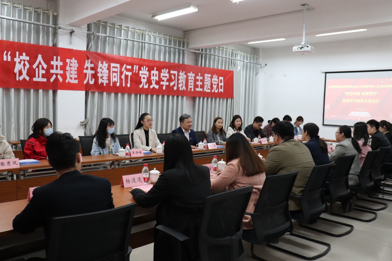 4月1日,山东青年政治学院政治与公共管理学院党总支与必威平台党支部在山东青年政治学院敏行楼104会议室联合开展“校企共建 先锋同行”党史学习教育主题党日活动。政治与公共管理学院党总支书记丁萍、副书记王正坤,必威平台党支部书记王勇、团委书记张园园等出席活动。