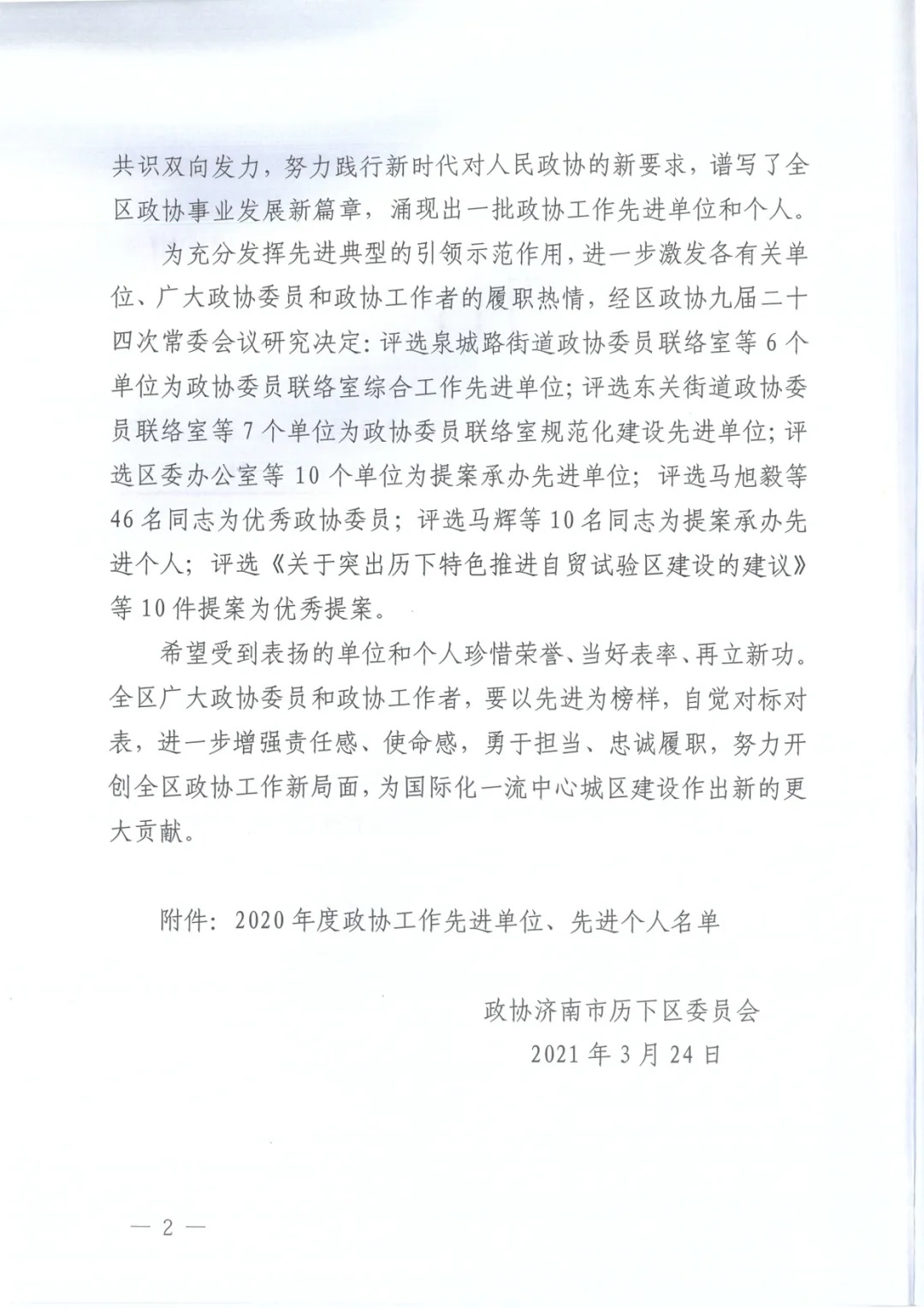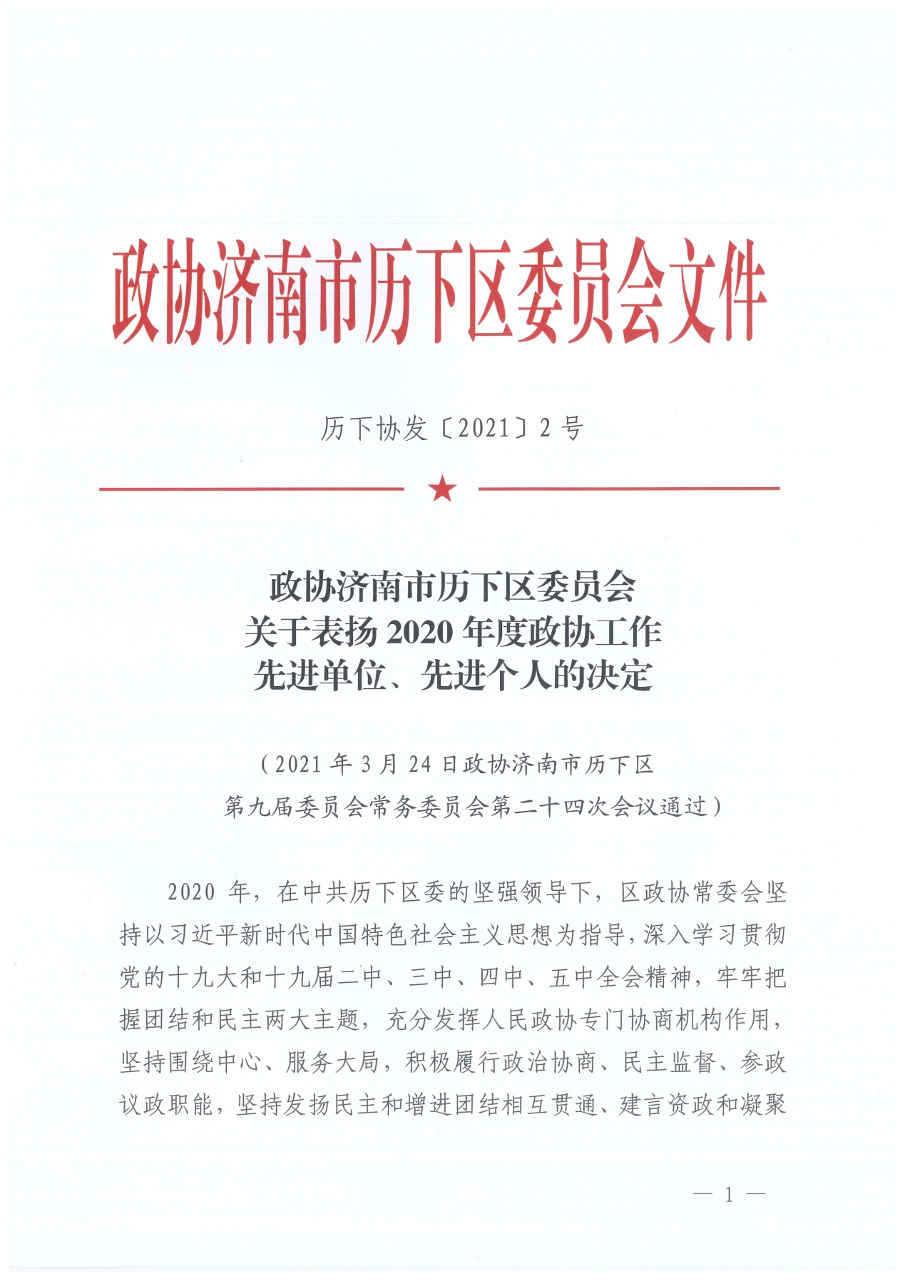 日前,政协济南市历下区委员会下发《关于表扬2020年度政协工作先进单位、先进个人的决定》文件,评选必威平台党支部书记王勇等46名同志为2020年度优秀政协委员。