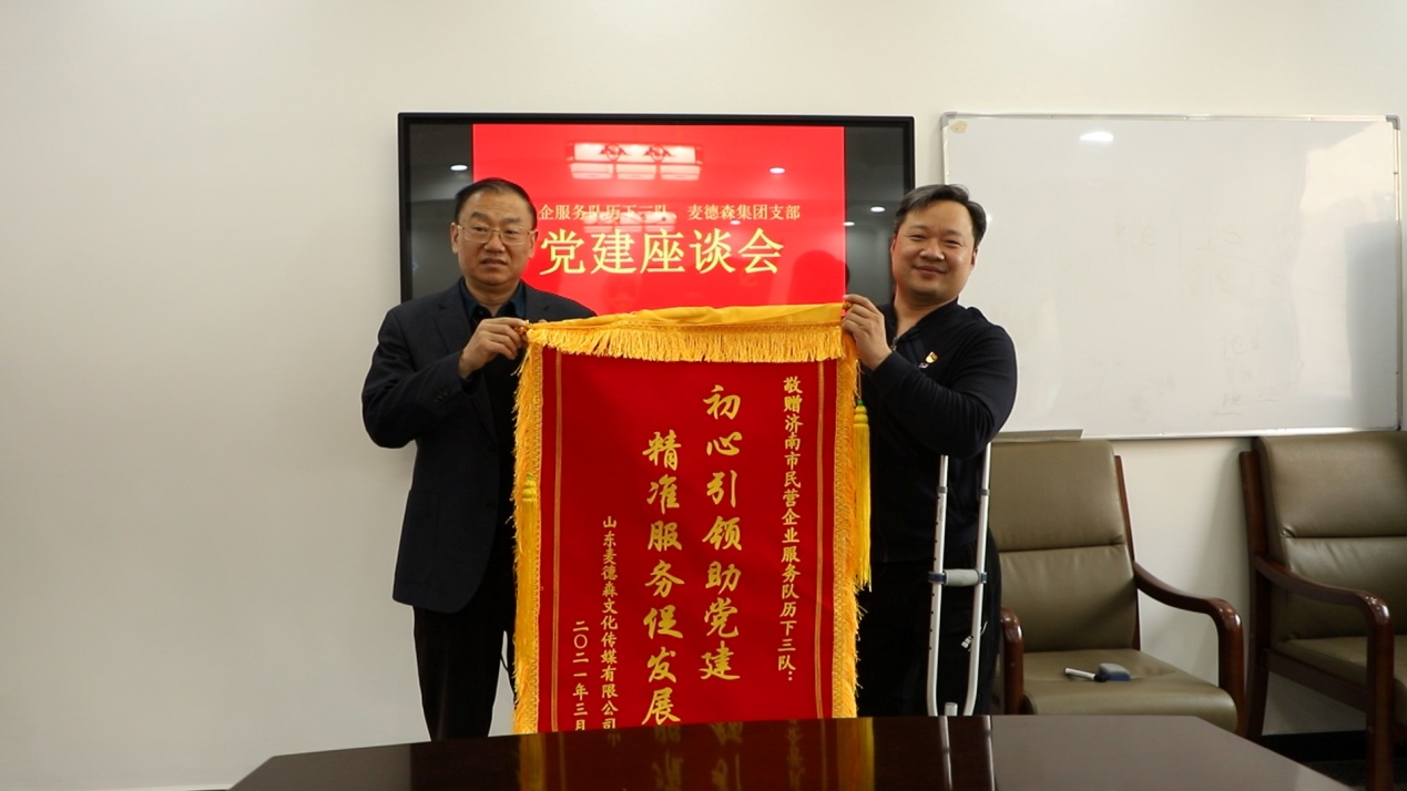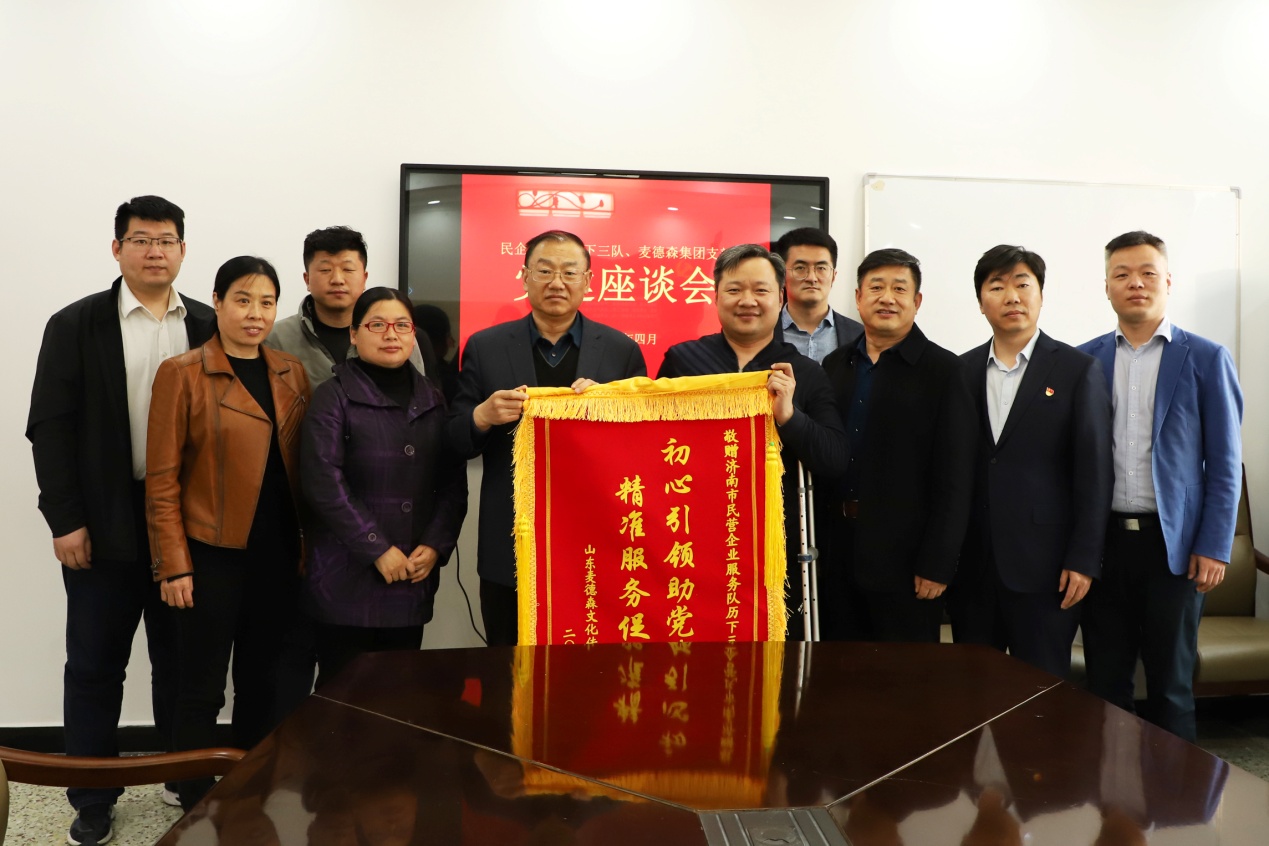 4月9日,民营企业高质量发展服务队历下三队与必威平台党支部在市千佛山街道党群服务中心会议室举行党建座谈活动,活动中,为感谢服务队长期以来对麦德森的支持和帮助,集团党支部将绣有“初心引领助党建 精准服务促发展”的锦旗赠送给民营企业高质量发展服务队历下三队。