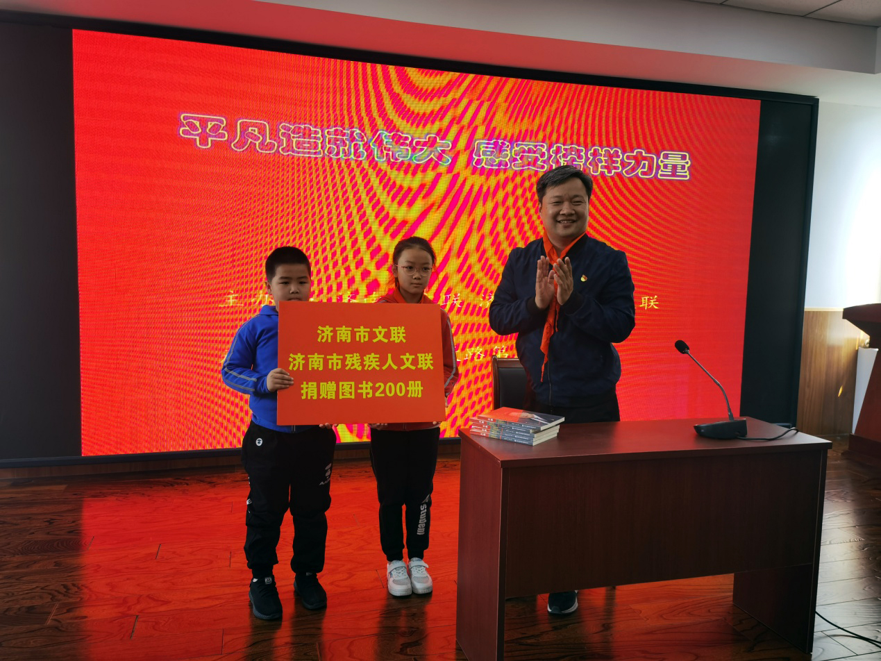 活动现场,王勇书记为同学们讲述了中国共产党党史和他本人求学创业的奋斗事迹,并代表济南市文联、市残文联向学生们捐赠图书200册。他勉励同学们,要继承和弘扬革命先辈不怕苦、不怕累、不怕牺牲的精神,努力学习,争做品学兼优的社会主义建设者和红色接班人。
