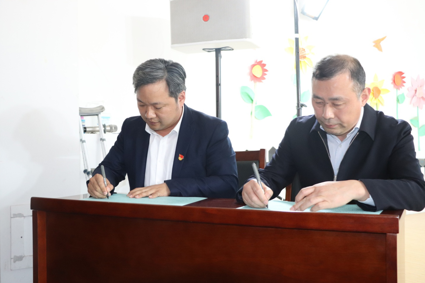 必威平台党支部书记王勇(左)与菏泽市民政局副局长马超签约。