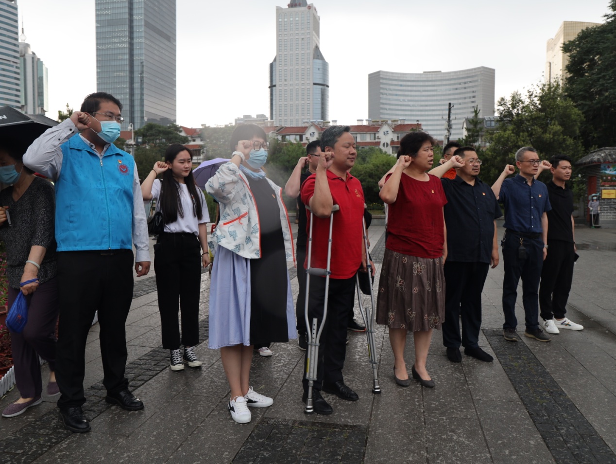 随后,历下区残疾人联合会党组书记、理事长何力明带领全体党员面向党旗重温入党誓词,在随风飘扬的红旗下,庄严宣誓“我志愿加入中国共产党,拥护党的纲领,遵守党的章程,……”,党员们激昂声音在解放阁前经久不息。