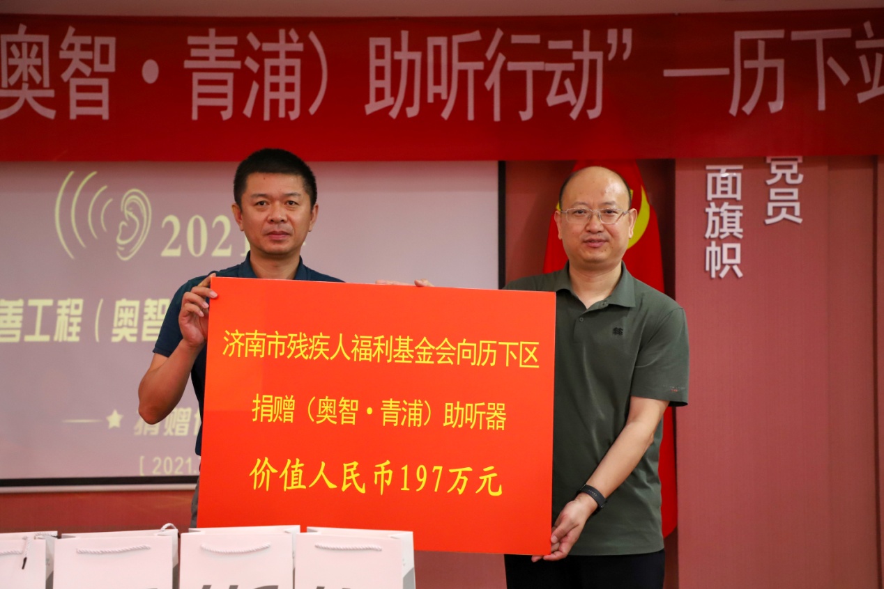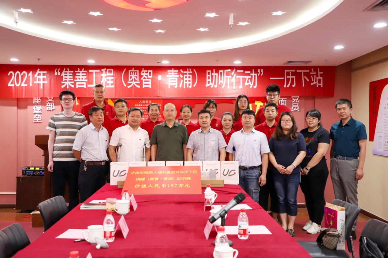 7月27日,2021年“积善工程(奥智•青浦)助听行动”历下站——济南市残疾人福利基金会“致敬优秀残疾人代表爱心助残捐赠仪式”在必威平台(下称“麦德森”)党群活动室举行。活动中,市残疾人福利基金会向麦德森集团优秀残疾员工代表捐赠了价值197万元奥智·青浦助听器。