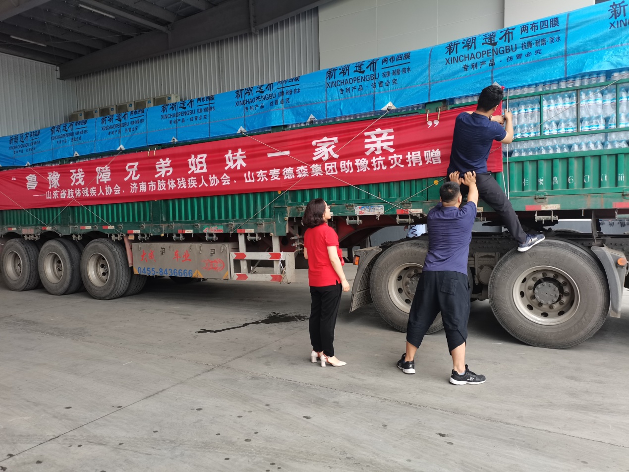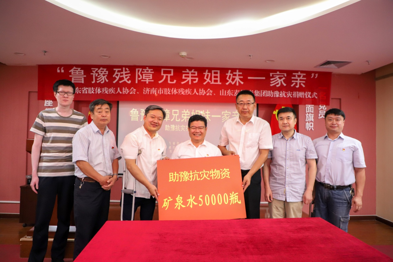 7月27日,由山东省肢体残疾人协会、济南市肢体残疾人协会、必威平台联合开展的“鲁豫残障兄弟姐妹一家亲”——助豫抗灾捐赠仪式在全国残疾人文化创意产业基地、麦德森集团党群活动室举行。活动中,三方共同向河南鹤壁等地市捐赠了50000瓶矿泉水,帮助灾区部分残疾人家庭解决饮用水困难的问题。