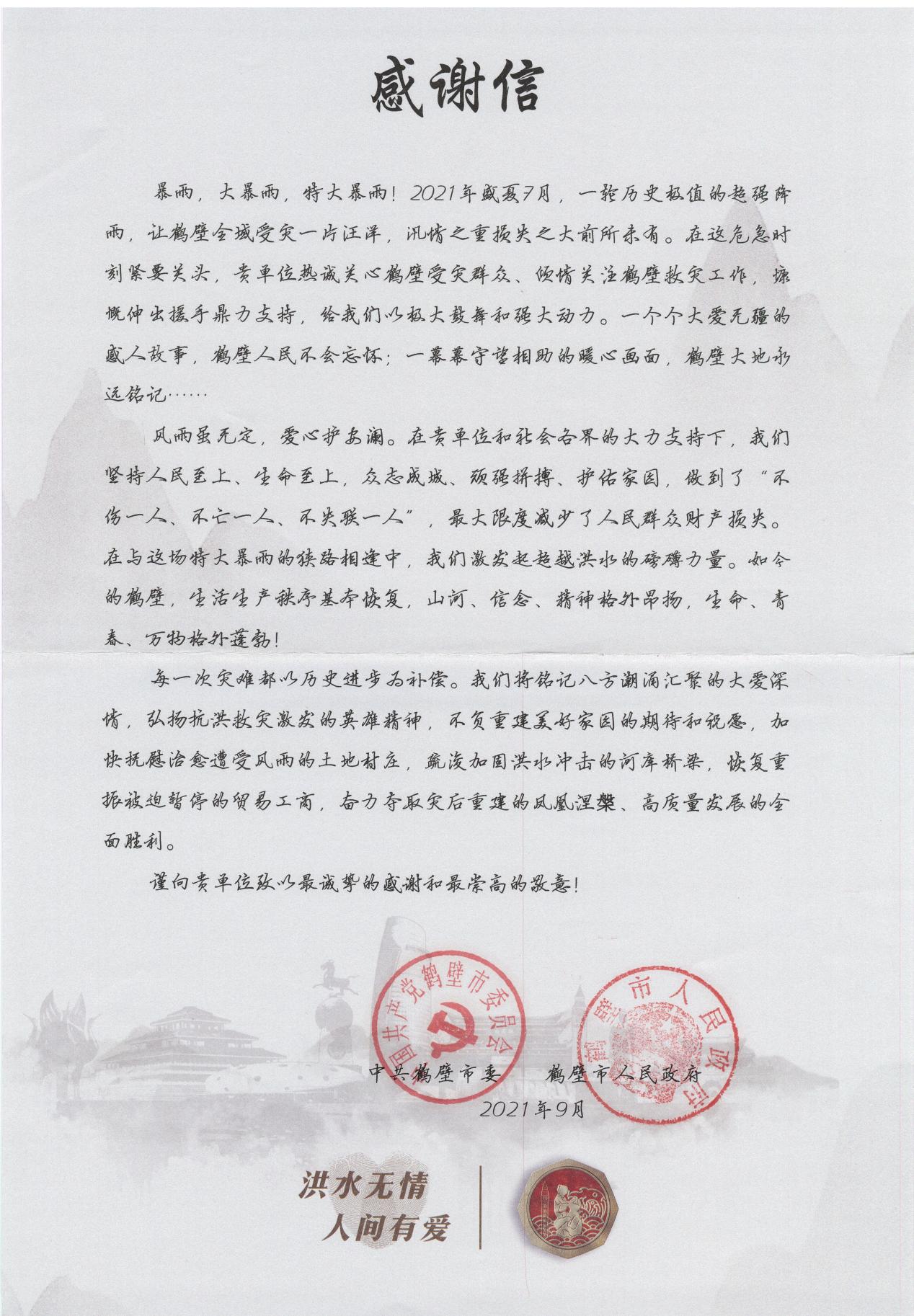 鹤壁市残疾人联合会为麦德森送来《感谢信》