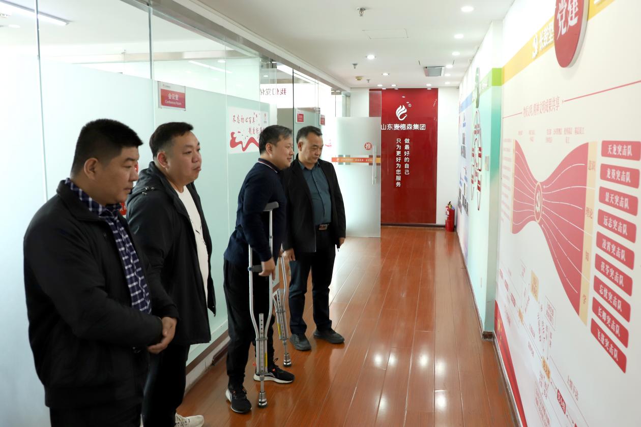 在王勇的带领下,申国强一行对麦德森总部进行了参观,查阅了集团党员手抄党章、党日活动征文等企业党建工作材料。