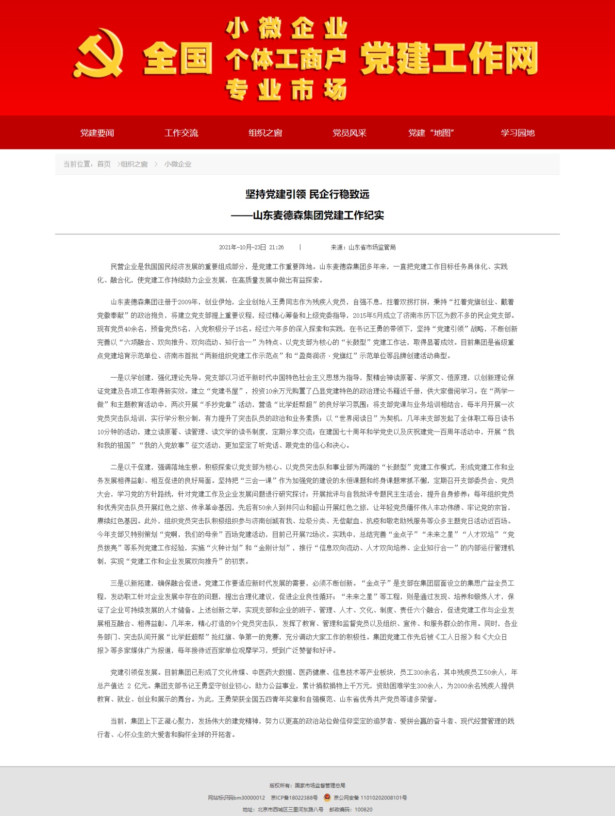 日前,国家市场监管局全国“小个专”党建工作网“组织之窗”专栏发表题为《坚持党建引领 民企行稳致远——必威平台党建工作纪实》文章,推广必威平台党建工作经验。文章指出,必威平台把党建工作目标任务具体化、实践化、融合化,使党建工作持续助力企业发展,在高质量发展中做出有益探索。