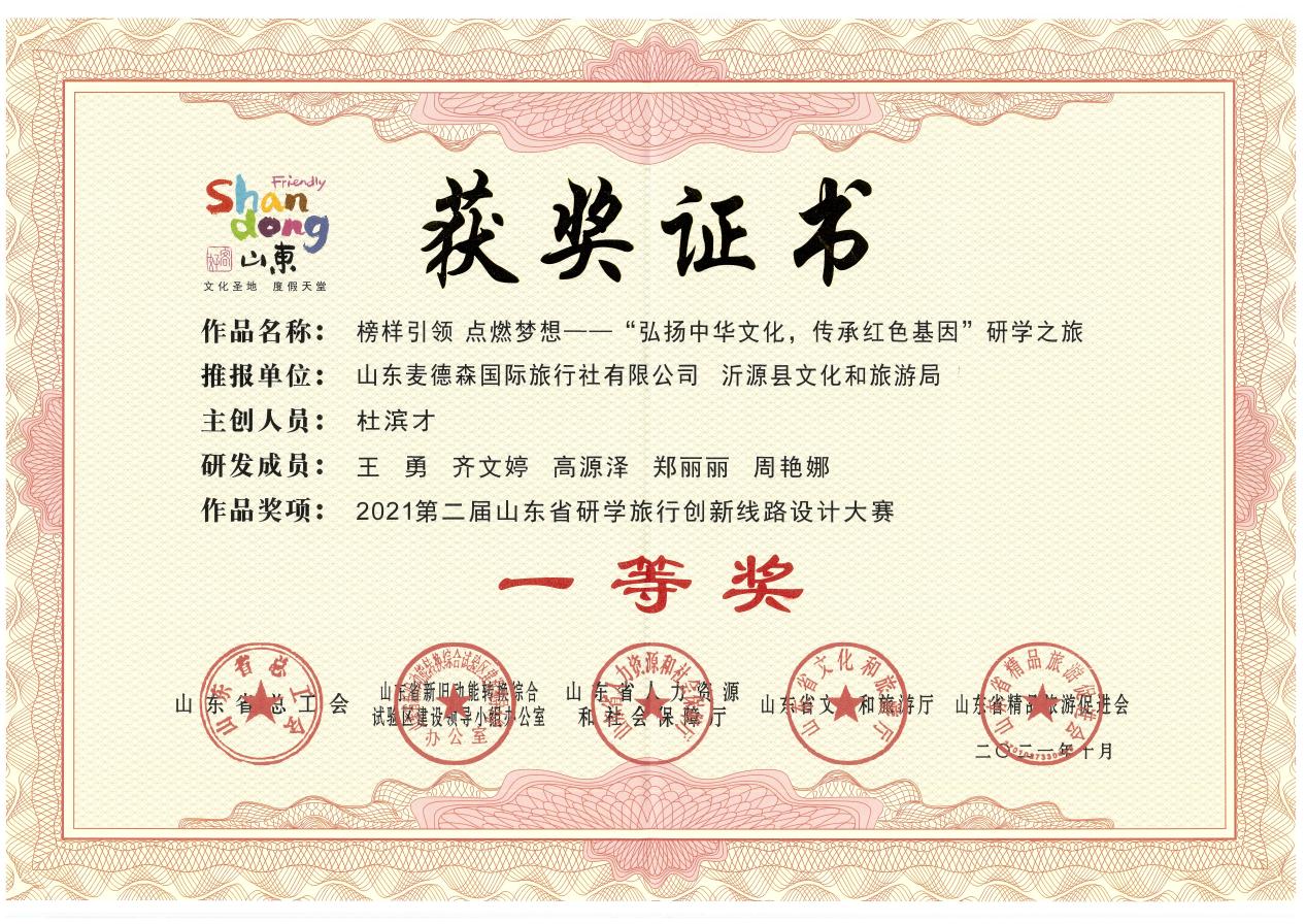 必威平台(下称“麦德森”)旗下山东麦德森国际旅行社有限公司研发团队原创作品《榜样引领,点燃梦想——“弘扬中华文化,传承红色基因”研学之旅》从全省4000余件申报作品中脱颖而出,喜获一等奖。集团党支部书记王勇、山东麦德森国际旅行社有限公司总经理杜滨才携“麦德森旅游”团队参加颁奖仪式。