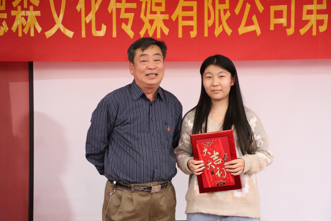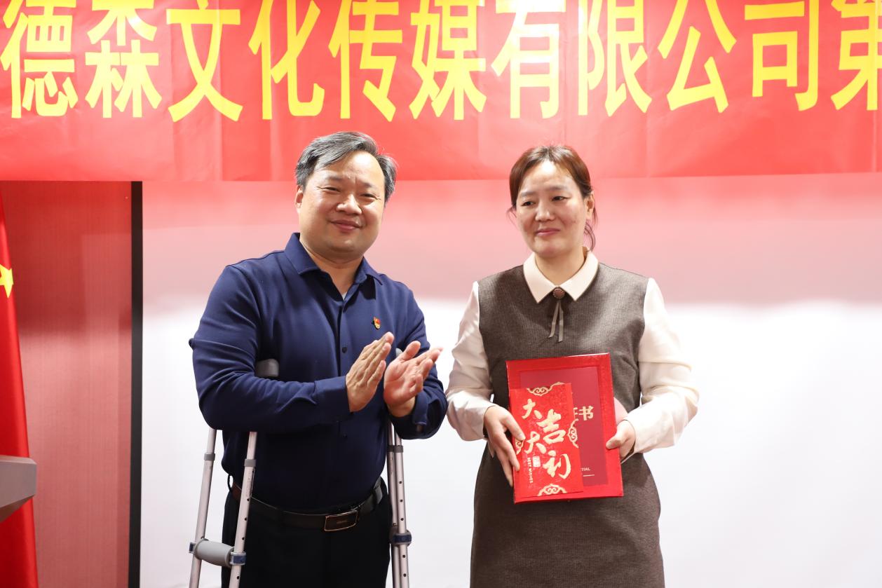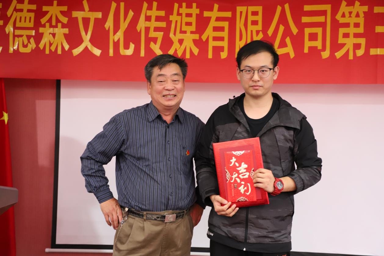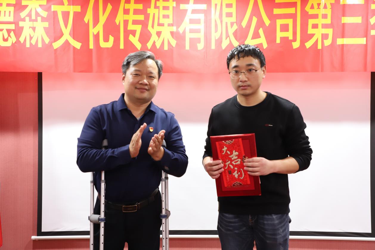 王兴法执行董事宣读了《关于表彰2021年度第三季度销售冠军的通报》,并为麦德森文化传媒第三季度销售冠军获得者孙明涛颁发销冠奖杯和荣誉证书。
