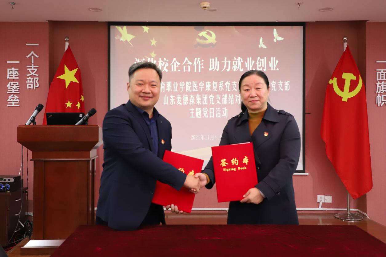 会上,麦德森党支部与山东特殊教育职业学院医学康复系党支部、综合四党支部举行了支部共建战略签约仪式。