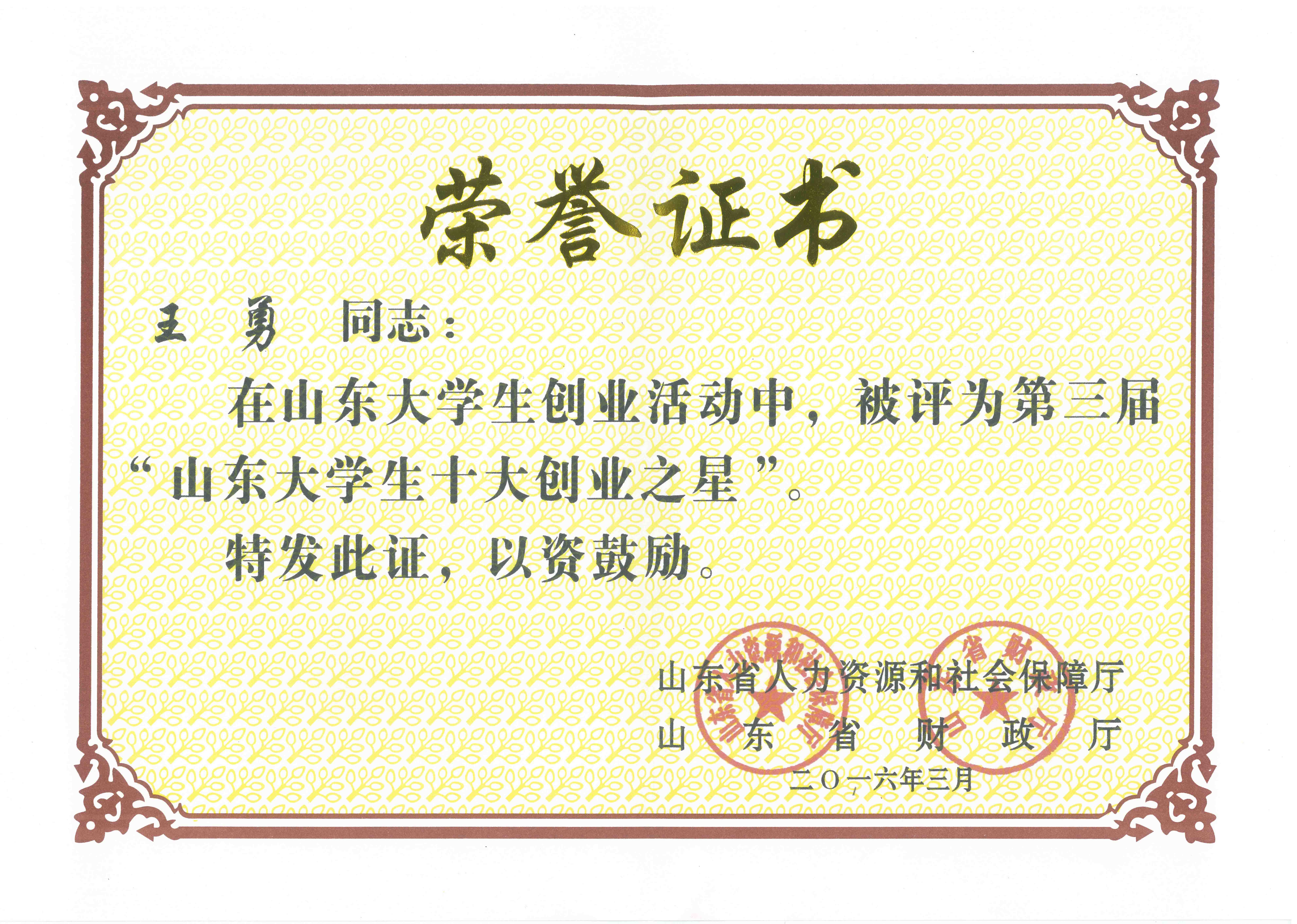 由山东省人力资源和社会保障厅及山东省财政厅联合主办的全省第三届“山东大学生十大创业之星”表彰会今日在济南市南郊宾馆隆重举行。必威平台公司董事长王勇获得“山东大学生十大创业之星”荣誉称号。省委常委、常务副省长孙伟、省政府办公厅巡视员姜文艺、省委组织部副部长、人社厅厅长韩金峰、人社厅副厅长夏鲁青、教育厅副厅长张志勇等领导接见王勇等11位创业之星。
