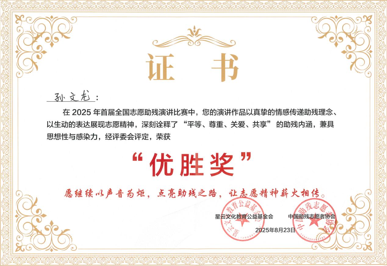 集团公益部部长孙文龙获2025年首届全国志愿助残演讲比赛“优胜奖”