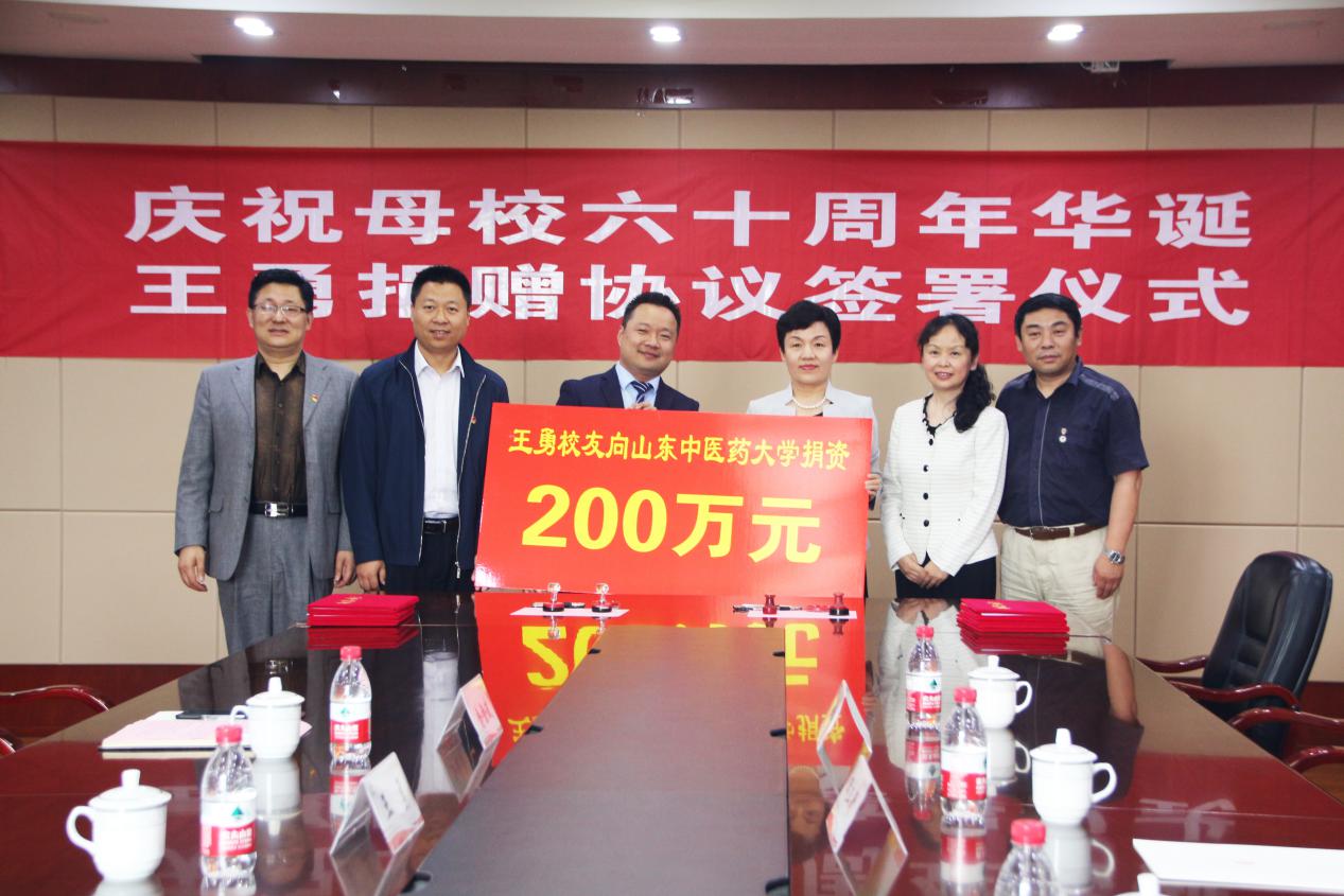 仪式中,王勇董事长与校方领导在现场签订了“博览医书”战略合作协议、图书捐赠协议、“王勇扶残助学基金”捐赠协议,以及“王勇研究生奖学金”捐赠协议,并借此校庆来临之际,为山东中医药大学捐赠了200万元资金,用于学校的发展和建设。