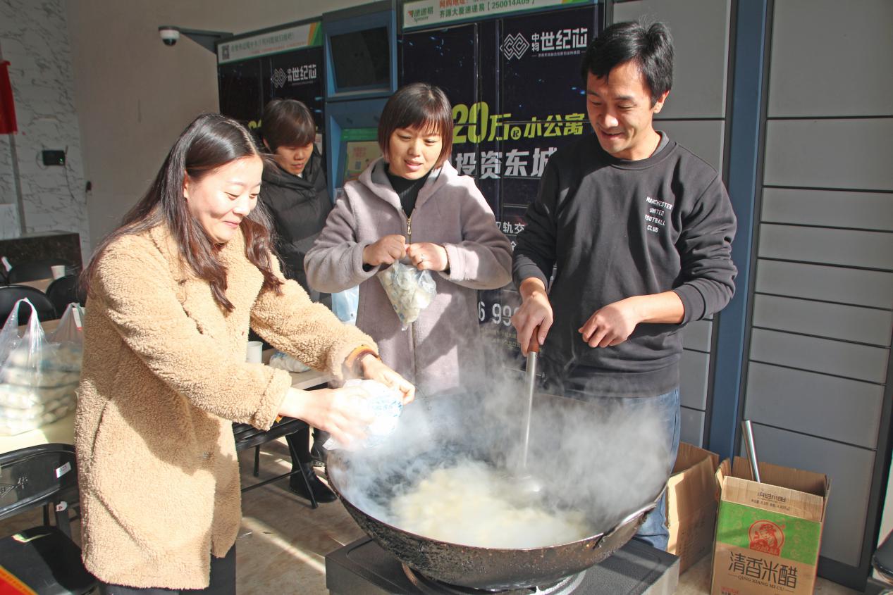 上午10点半,党员突击队队员们在集团公司党支部副书记桑守正同志的带领下,来到活动现场进行前期准备,原本安静的一楼大厅顿时热闹起来。有的悬挂横幅,有的摆放桌椅,有的架锅起灶……水饺下锅啦!